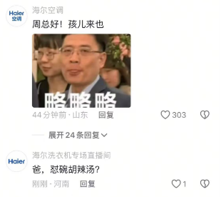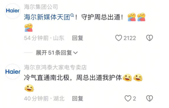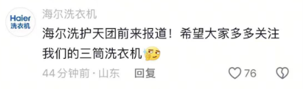 在评论区内,除了网友,不少海尔相关账号也纷纷组队“团建”: