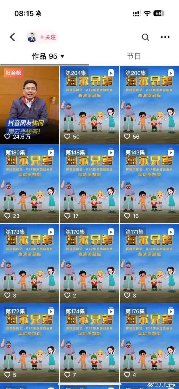 3月24日,在周云杰账号首页就能看到212集高清版海尔兄弟,网友热议:bgm一响是谁的童年回来了。