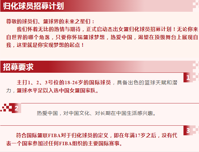 对于招募对象,盛帆俱乐部的公告上主要列出了三个主要条件:1.主打1号位(控球后卫)、2号位(得分后卫)、3号位(小前锋)的18—26岁的国际球员,具备出色的篮球天赋和潜力,篮球水平足以入选中国女篮国家队。2.热爱中国,对中国文化、对长期在中国生活感兴趣。3.符合国际篮联FIBA对于归化球员的定义,即在年满17岁之后,没有代表一个国家参加过任何FIBA组织的主要国际赛事。