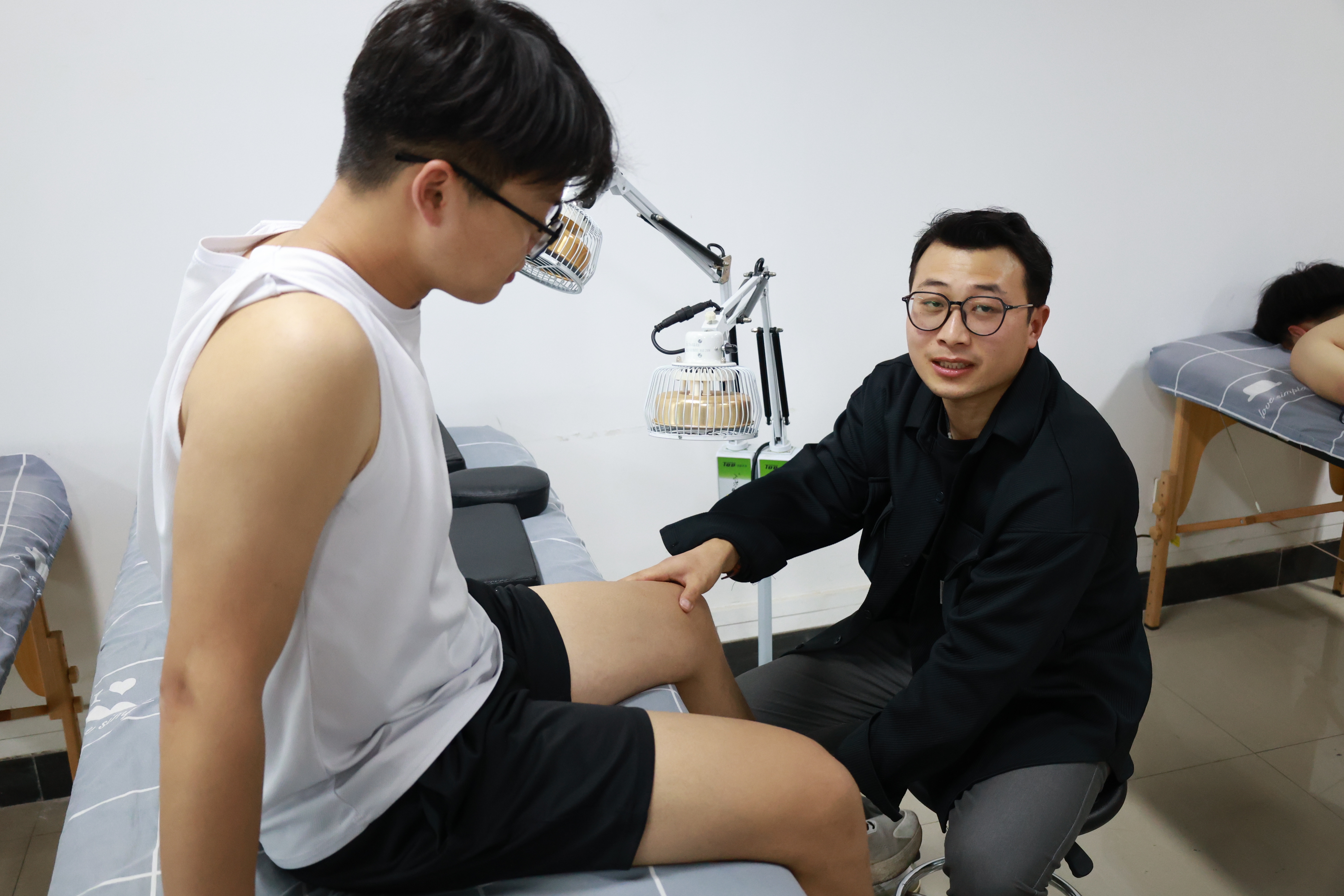 走进体育学院运动康复保健实验室,推拿床、理疗仪、牵引床、动态评估设备一应俱全。体育保健学专业教师周新楚正用肌筋膜刀为一名学生处理肩部粘连,刀头精准滑过肌肉纹理。他解释道:“筋膜刀能快速松解深层筋膜结节,配合动态拉伸,恢复关节活动度。”隔壁区域,翁天森老师则使用红外线理疗灯照射学生肿胀的膝部:“需先用热敷帮助局部活血散瘀,再结合肌效贴固定。”拔罐区,玻璃罐通过负压吸附在穴位上,学生志愿者邓海洋边操作边科普:“罐印颜色越深,说明局部瘀堵越严重,配合艾灸能加速代谢。”一旁的学生打趣道:“这罐子比筋膜枪还懂‘痛点’!”