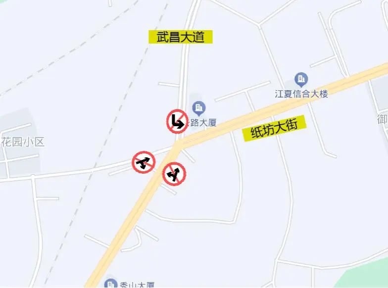 3、纸坊大街与江夏大道交汇路口:纸坊大街由东向西方向的车辆一律右转。