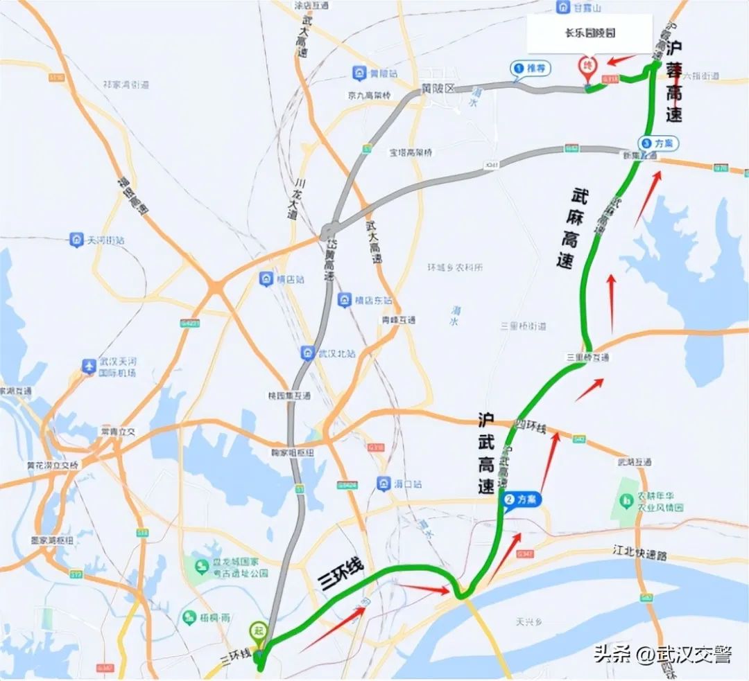 线路2:三环线→沪武高速→武麻高速→沪蓉高速→黄陂东收费站→G318→长乐园。
