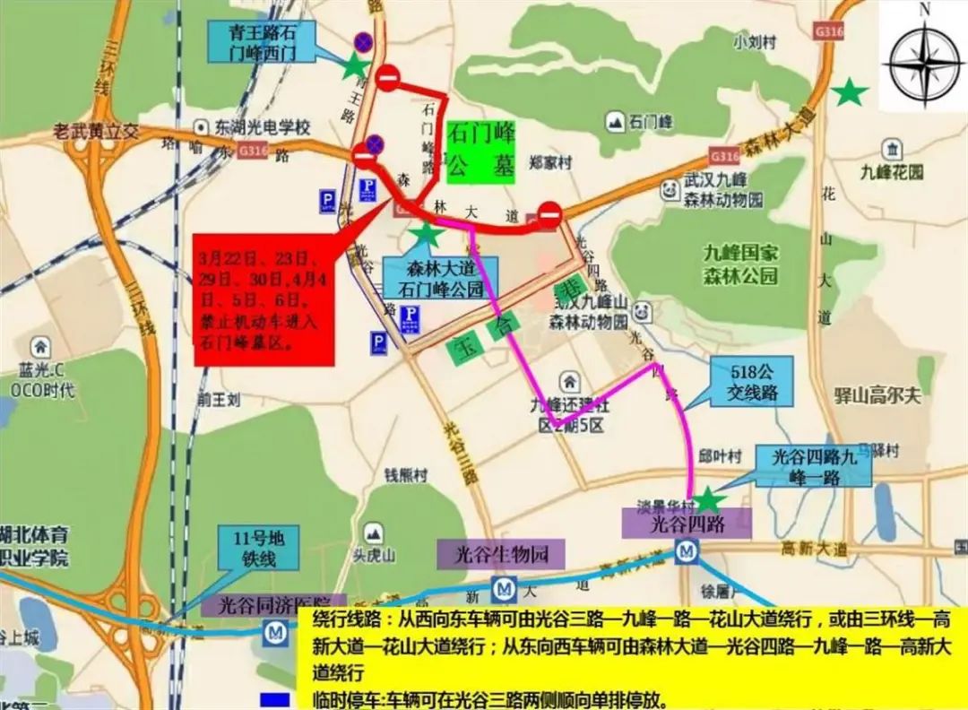 管制路段:森林大道(青王路至光谷四路)禁止机动车通行(公交车除外);青王路(落雁立交至珞喻东路)禁止载货汽车通行,青王路石门峰路口实行交通管制,自东向西单向通行;