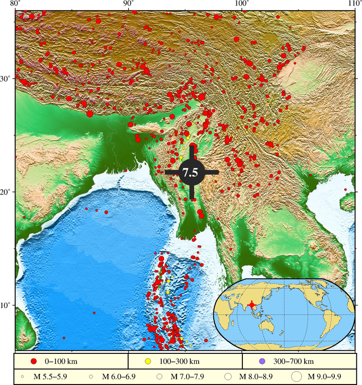 3月28日14时20分在缅甸(北纬21.85度,东经95.95度)发生7.9级地震。缅甸最大城市仰光震感强烈。本次地震造成泰国全国各地都有震感,曼谷市中心高层建筑内的震感明显,曼谷震感持续数分钟,民众纷纷离开高层建筑,涌到街上。