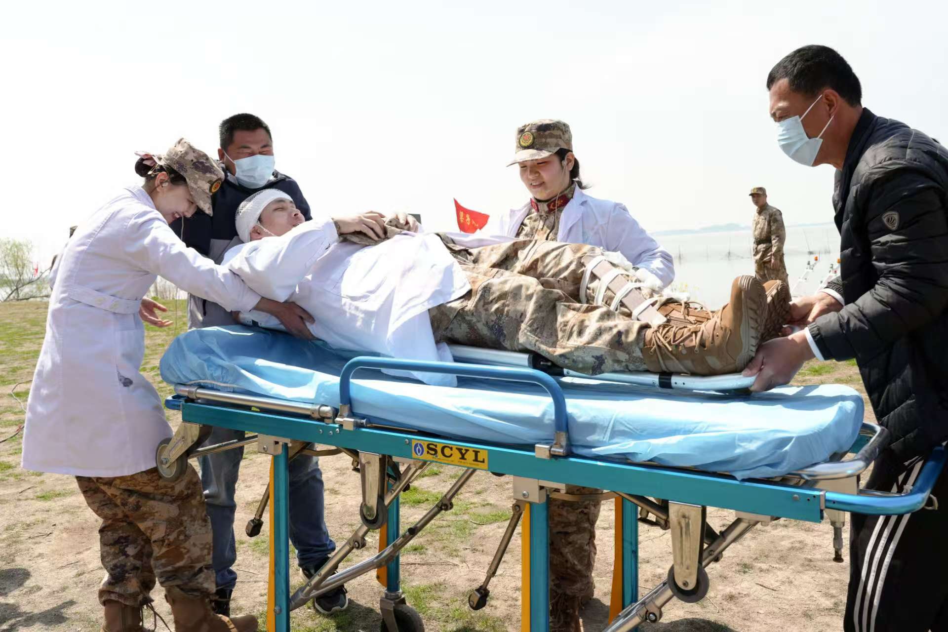 民兵医疗分队救治模拟伤员。 通讯员胡飞 摄。