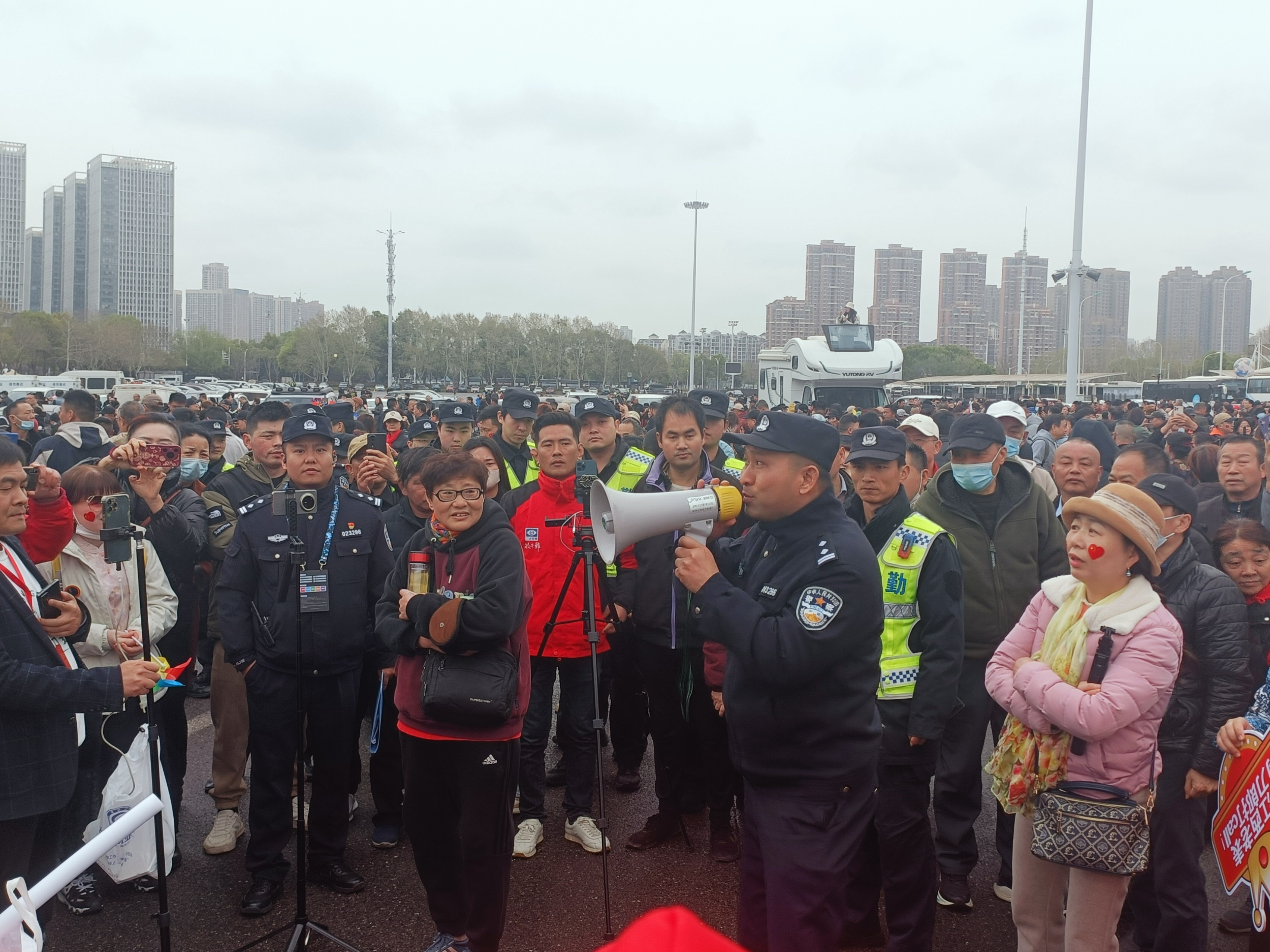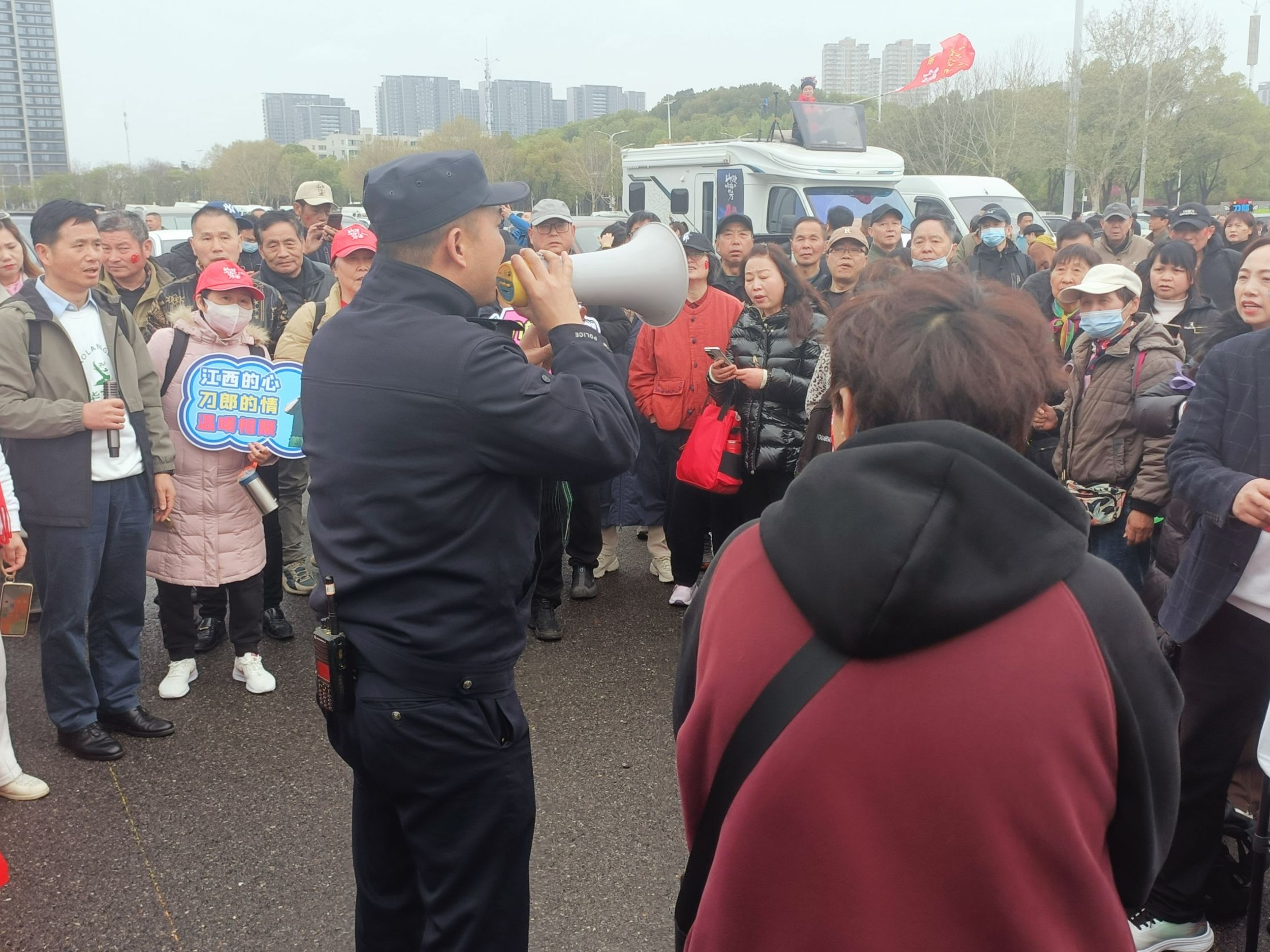 民警贺铖(拿喇叭者)现场劝导刀迷。通讯员武龚萱 摄