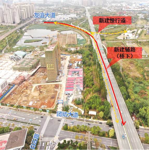 新建的三环线辅路连接友谊大道与团结大道,总长约1.06公里,标准段宽8米;新建的慢行道连接友谊大道立交东西两侧及友谊大道至团结大道,长约1.54公里,宽4米。