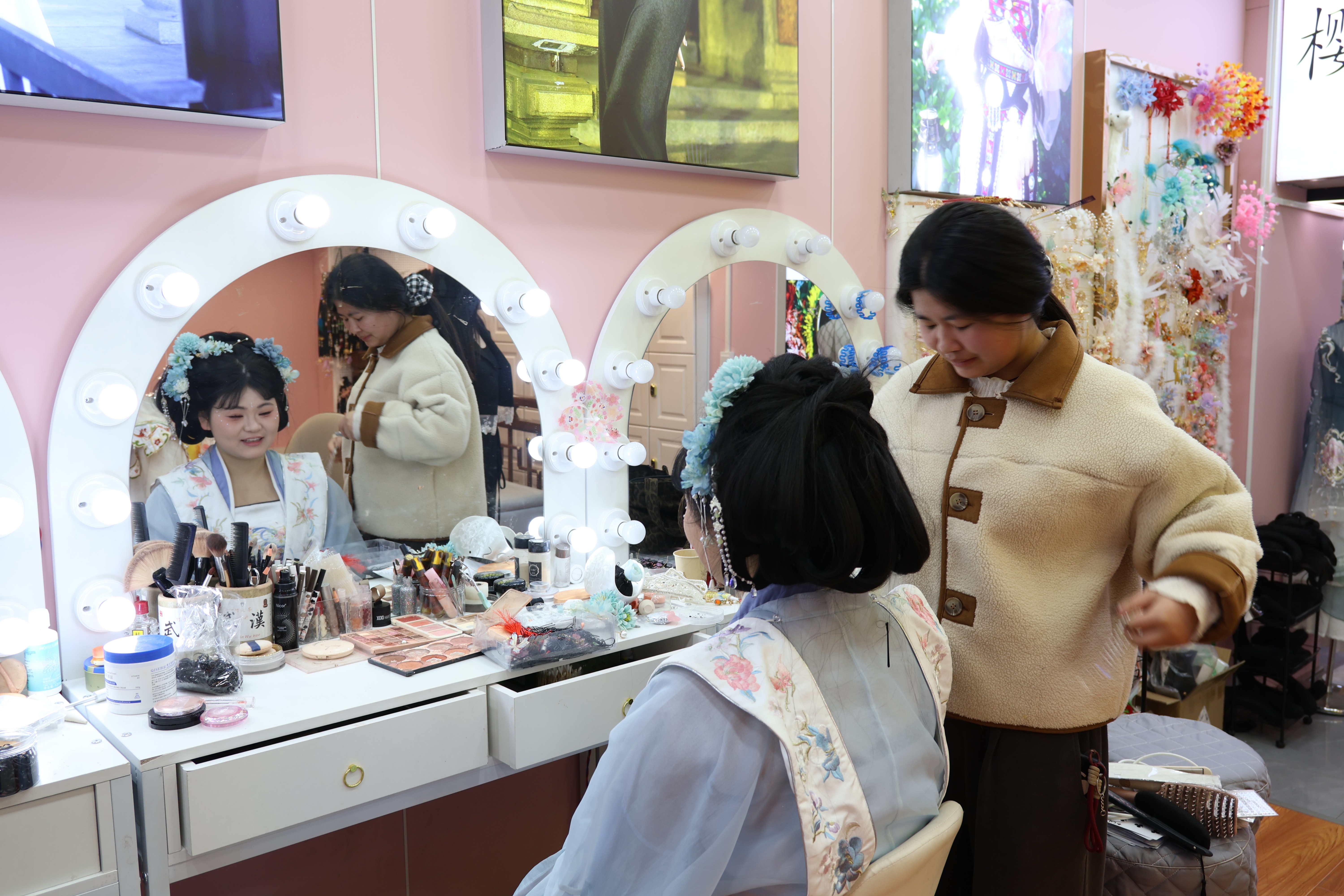 虽然武汉离家远,但由于她和老板是老相识,家人也比较放心。她表示,近期是汉服妆造行业的旺季,她刚来武汉就进入了忙碌的工作状态。天气好的时候,最多时一天能为10多为顾客化妆。