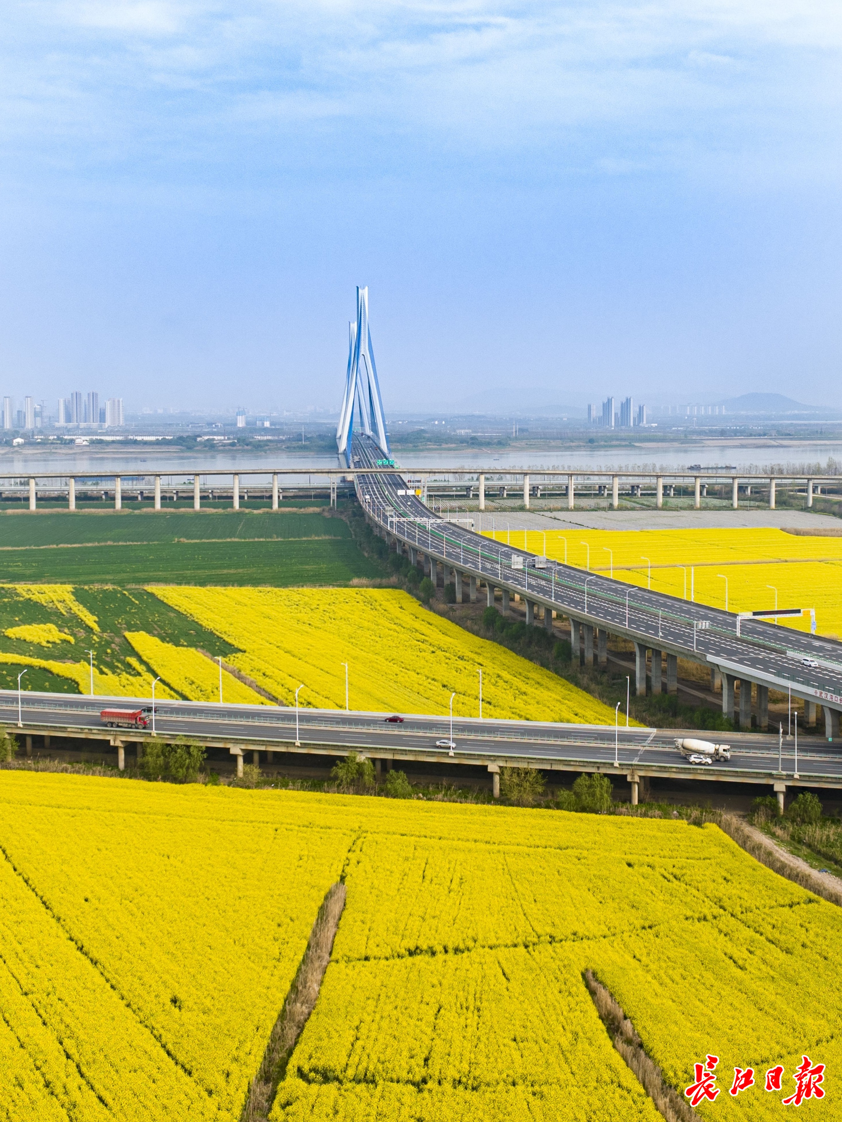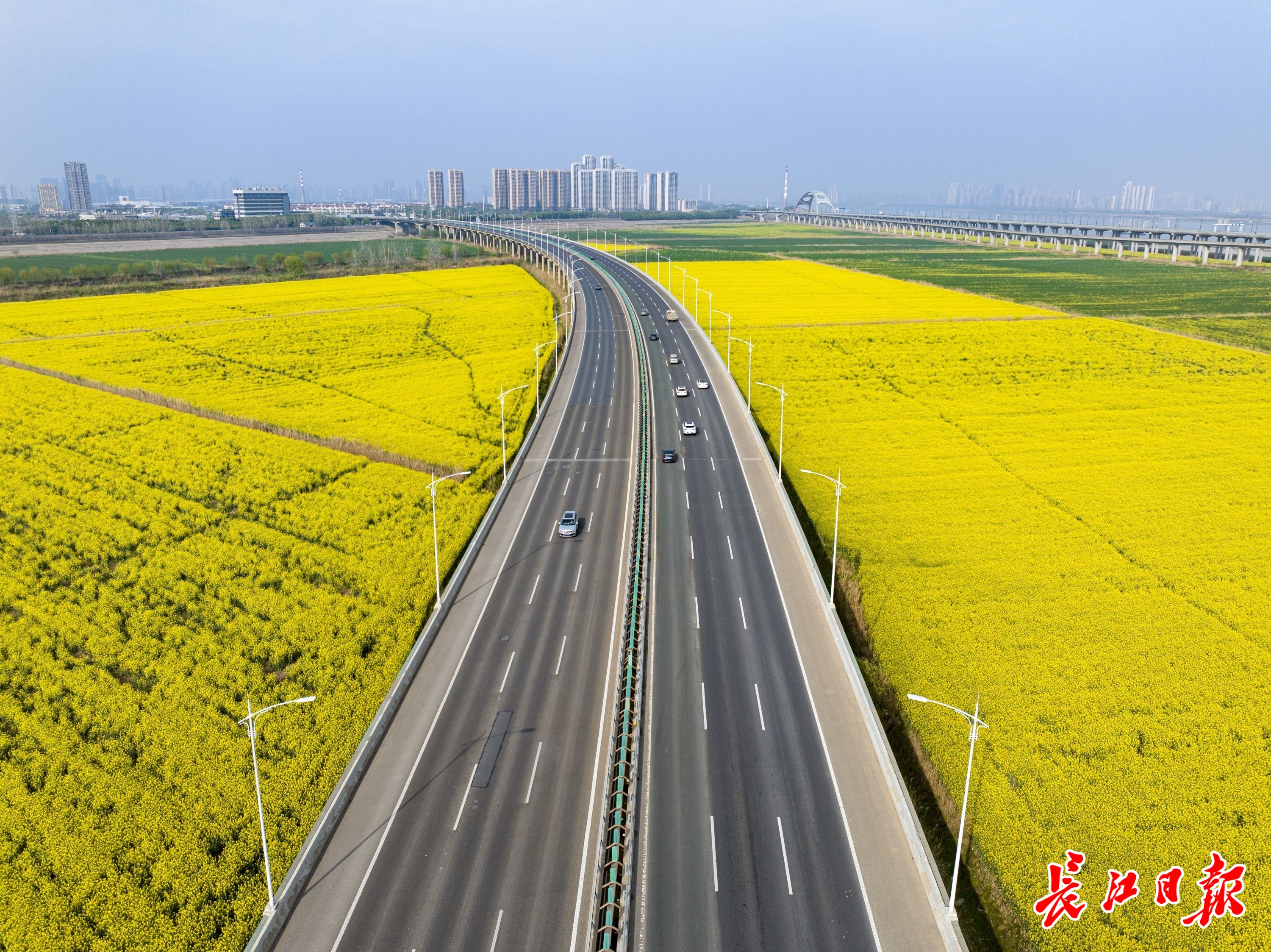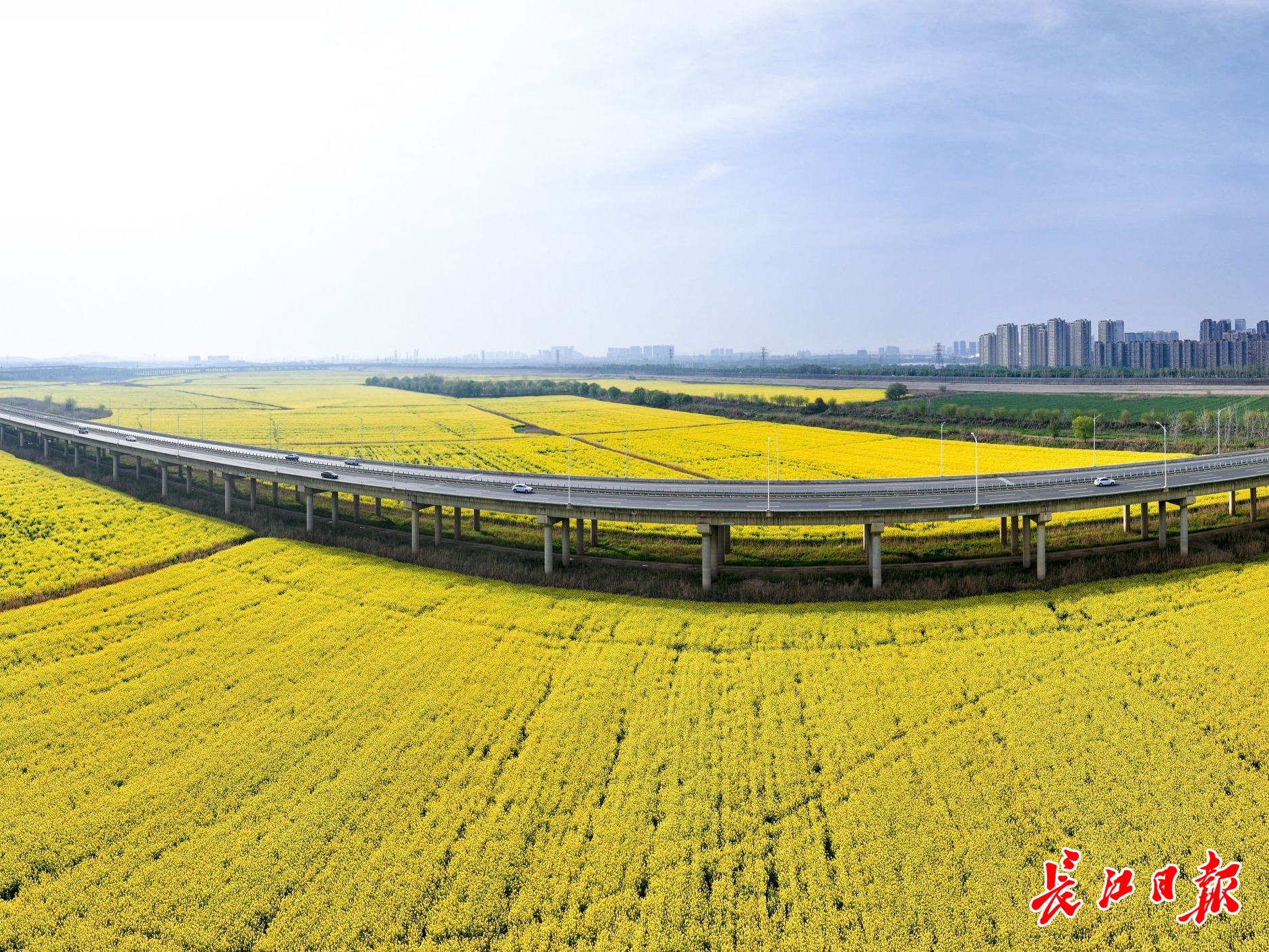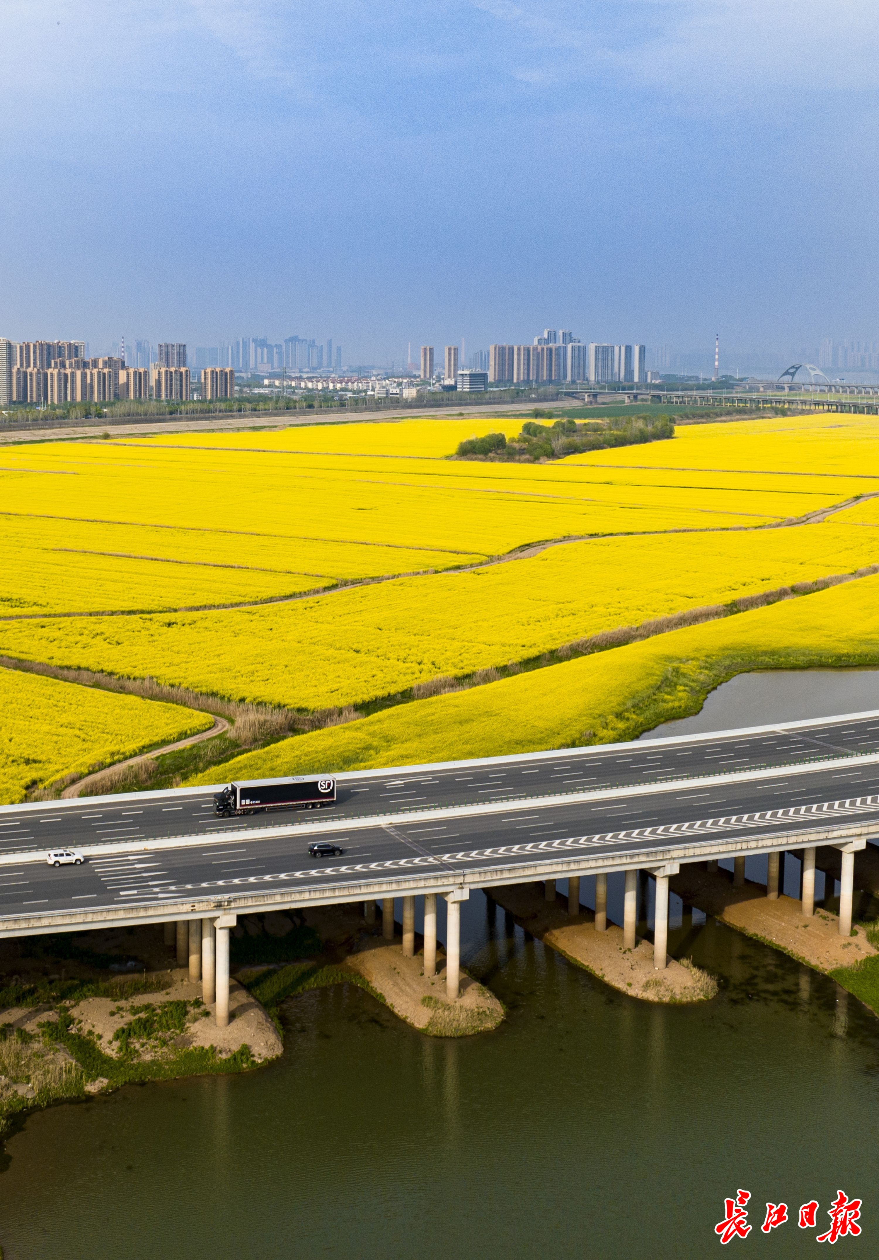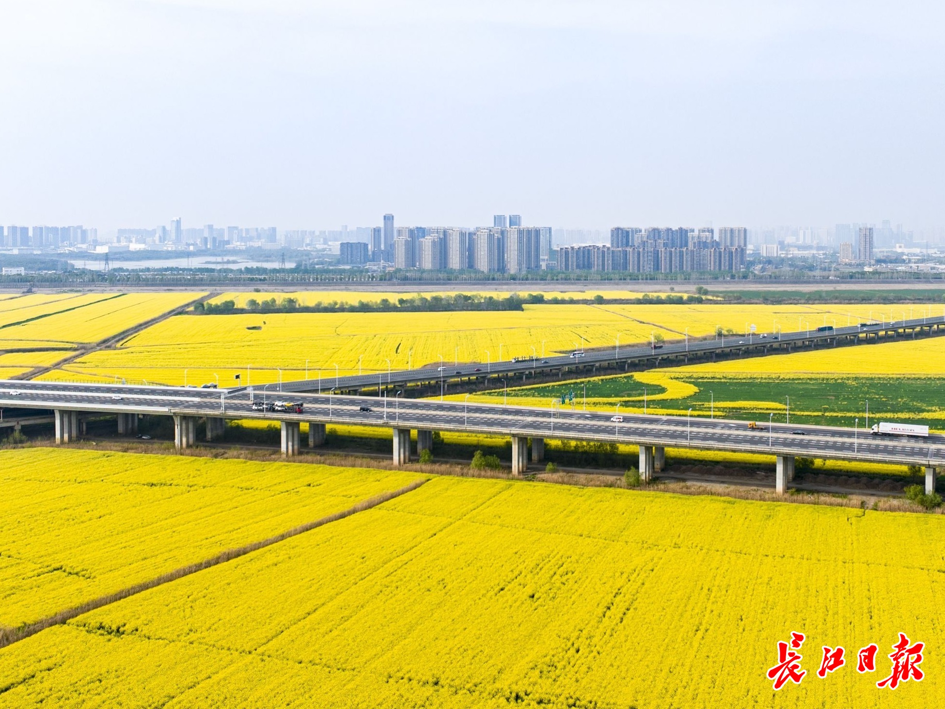 4月2日,记者现场探访小军山,航拍可见,江滩特大桥与四环线交会处一带,万亩油菜花正在盛开。油菜花田在阳光的照耀下,宛如一片金色的海洋。地铁高架线路置于其中,构成了一幅奇特壮观的风景画。