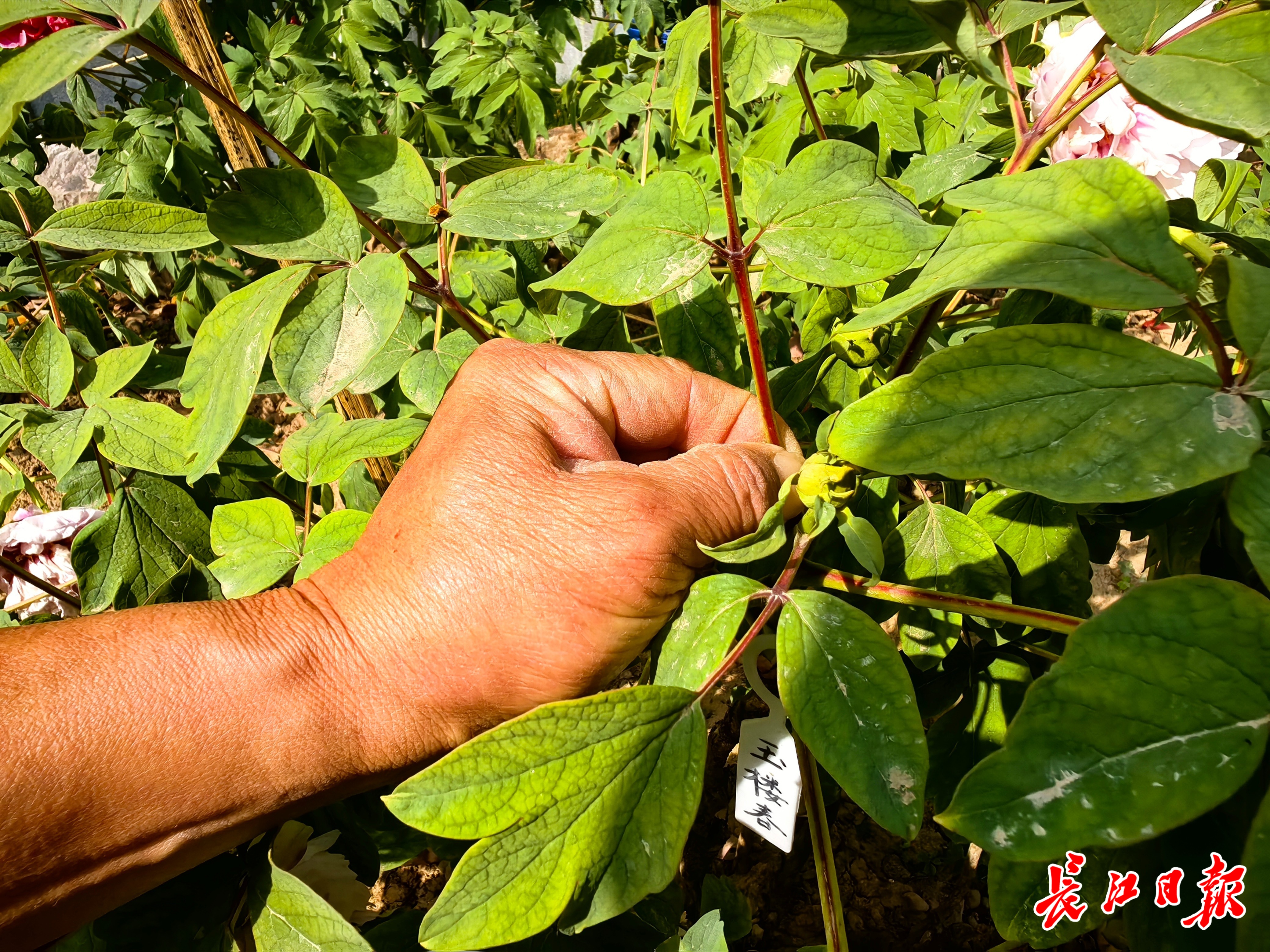 金权师傅扒开一株牡丹顶部的叶片,指着一枚花蕾说:“这个花蕾小,比旁边的叶子矮,已经废掉了,不会开花了。”围观市民表示不解,瞪大了眼睛。