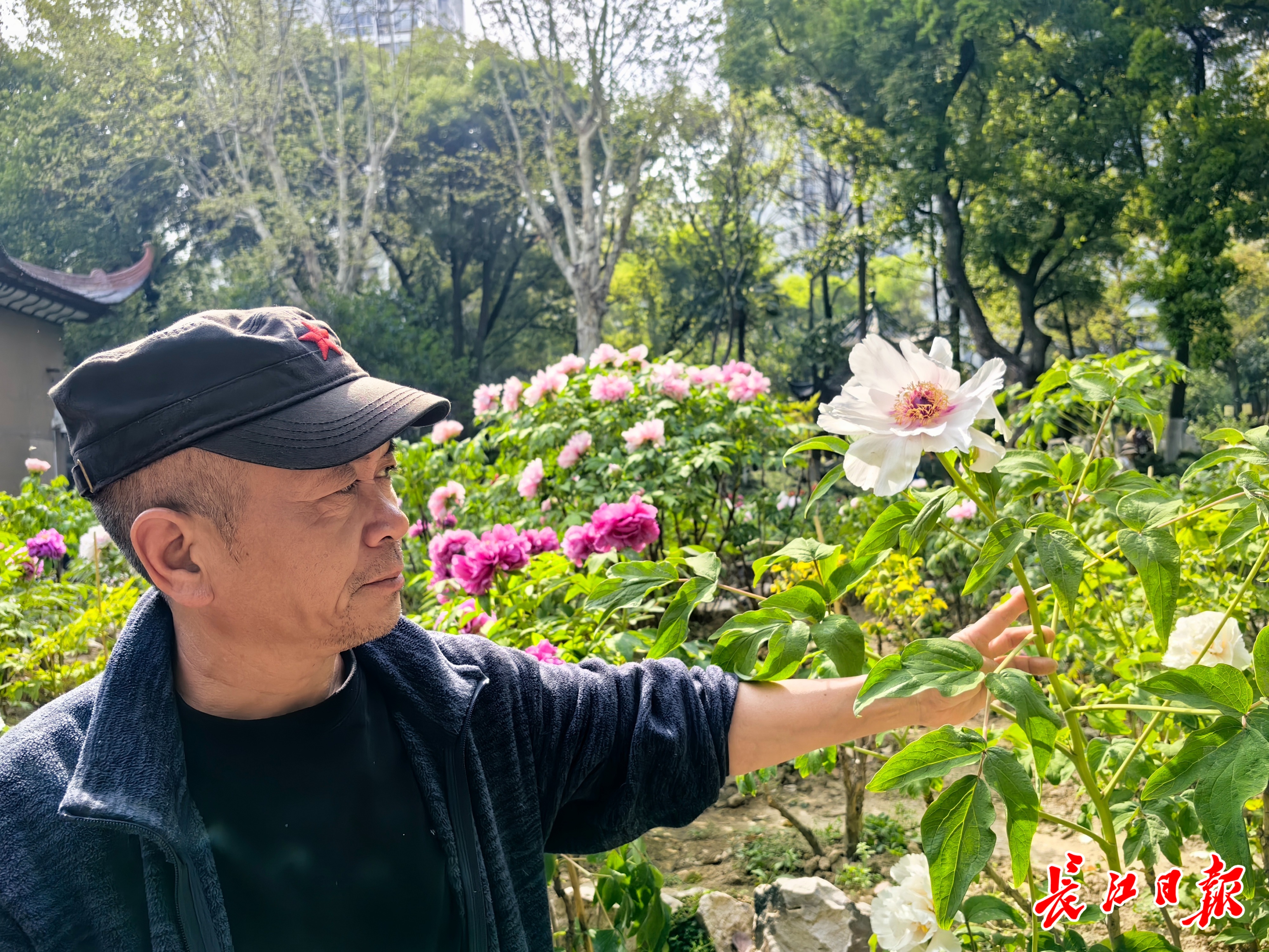 金权师傅察看香玉牡丹上长出的“返祖”凤丹牡丹。长江日报记者 明眺生 摄