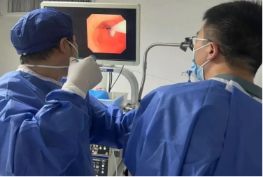 接诊后,儿Ⅱ科负责人刘苗和姜毅教授团队迅速启动应急预案,由陈江南医生、梁章武医生及刘晓琴护士长组成救治团队紧急施治。胸部CT显示,一枚长约4厘米的金属弹簧嵌入右主支气管,其锐利边缘随着孩子的呼吸,不断摩擦气道黏膜,可能引发大出血或窒息。