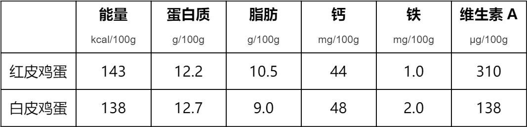 比如上表里红皮鸡蛋和白皮鸡蛋,不同蛋壳颜色的鸡蛋在主要营养成分上差异并不大。