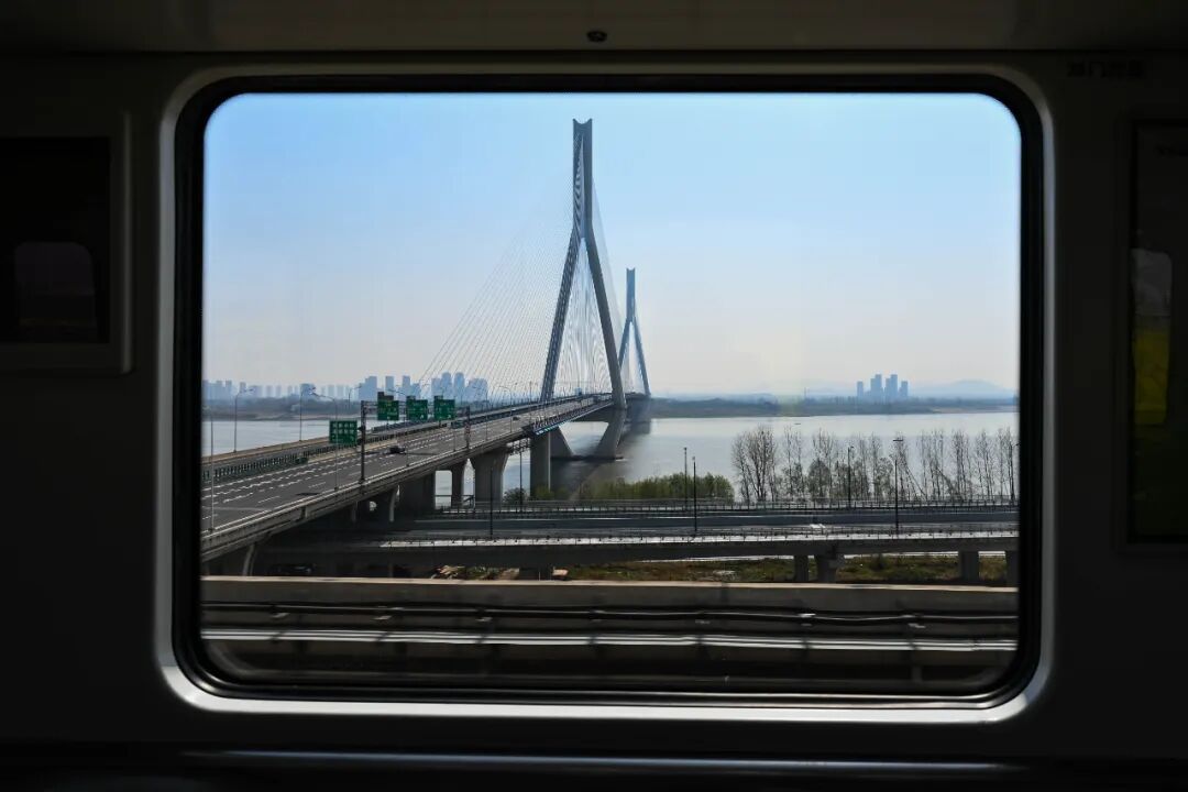 我赶忙下车,冲到对面站台,眼巴巴地等着反方向的列车。这次,我收获了另一番景致。右侧窗外,沌口长江大桥横跨江面,桥面宽阔,偶有车辆驶过,我连连按下快门,生怕错过任何瞬间。
