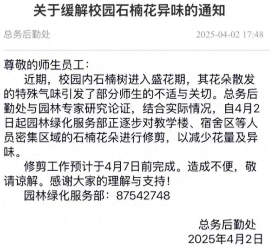 早前,杭州电子科技大学学生会也在3月8日发布推文称,为了避免人群密集处的石楠花气味对同学们正常生活造成影响,学生会联合后勤部门开展了校园石楠花修剪行动。