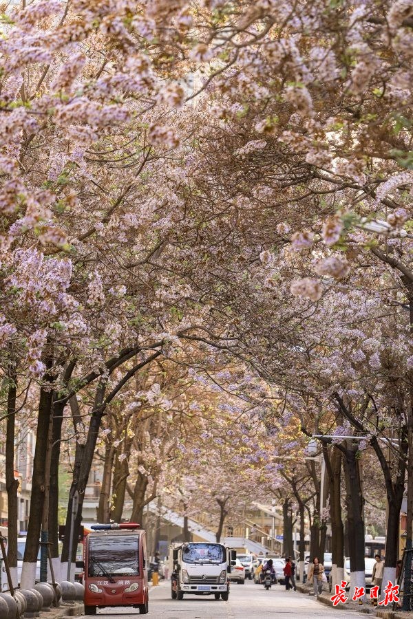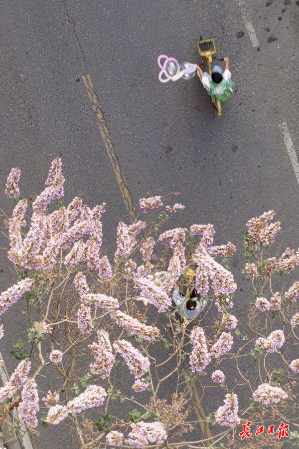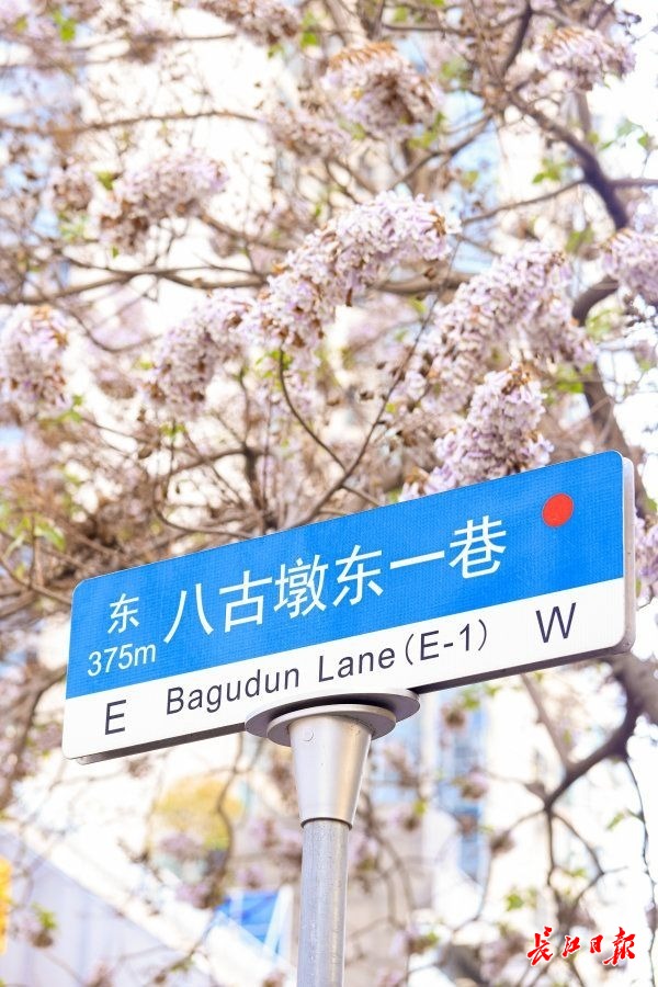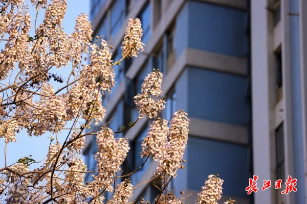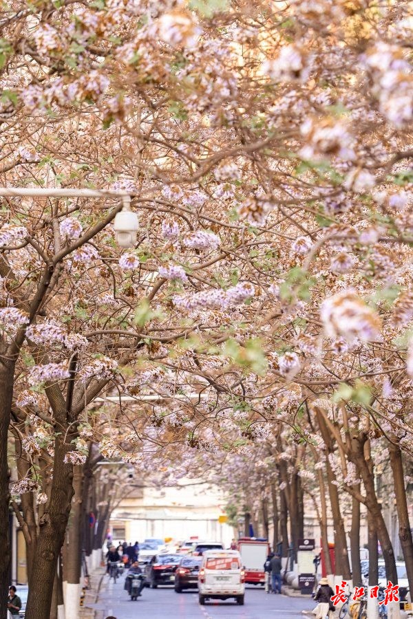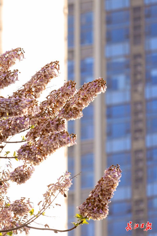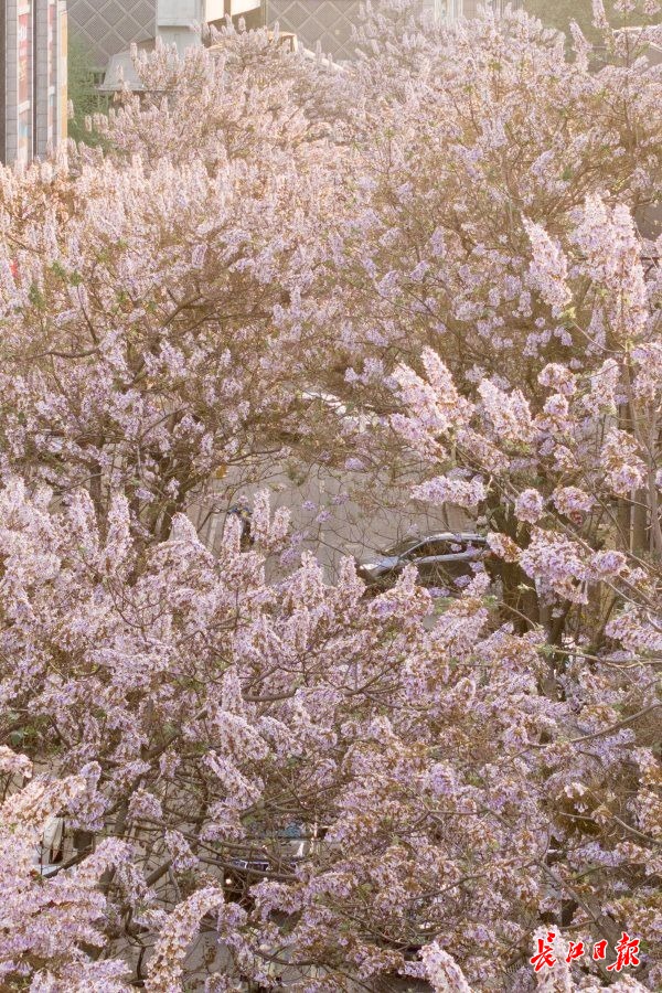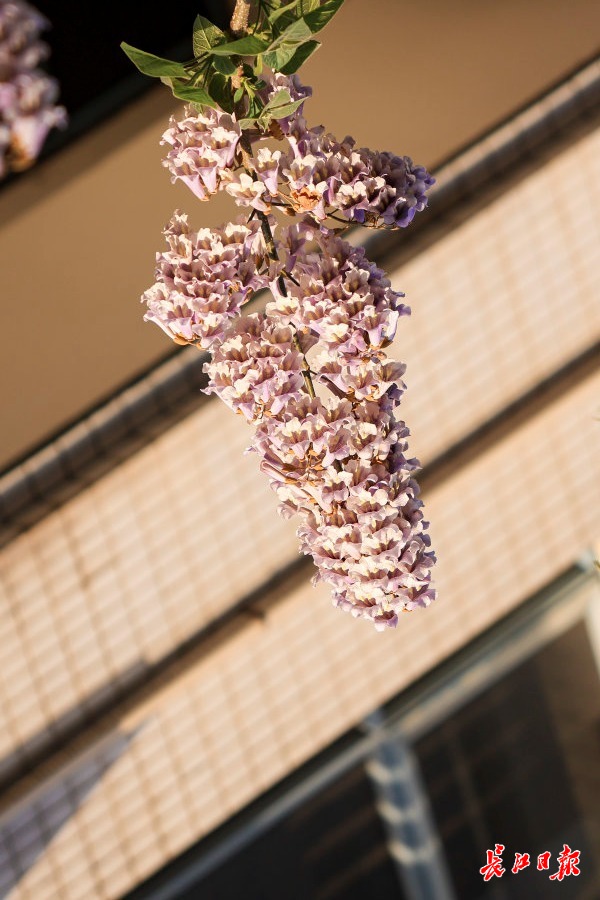 泡桐树在城区较为少见,江汉区仅有八古墩东一巷和福利路将泡桐树选作行道树。由于前期武汉气温较高,今年泡桐花的花期有所提前,清明前后迎来盛花期,天气晴好时拍出来的效果最好。