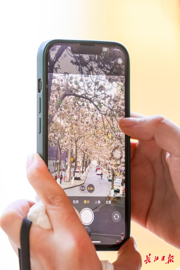 4月7日,长江日报记者在八古墩东一巷看到,道路两侧70余株泡桐树的树枝上挂满了巨大的紫色花冠,呈漏斗形状。整条道路被紫色的泡桐花包裹住,让人仿佛置身于紫色花海之中。春日暖阳洒在花树间,天桥上、马路边,市民游客驻足拍照赏花,享受武汉街头的春花浪漫。