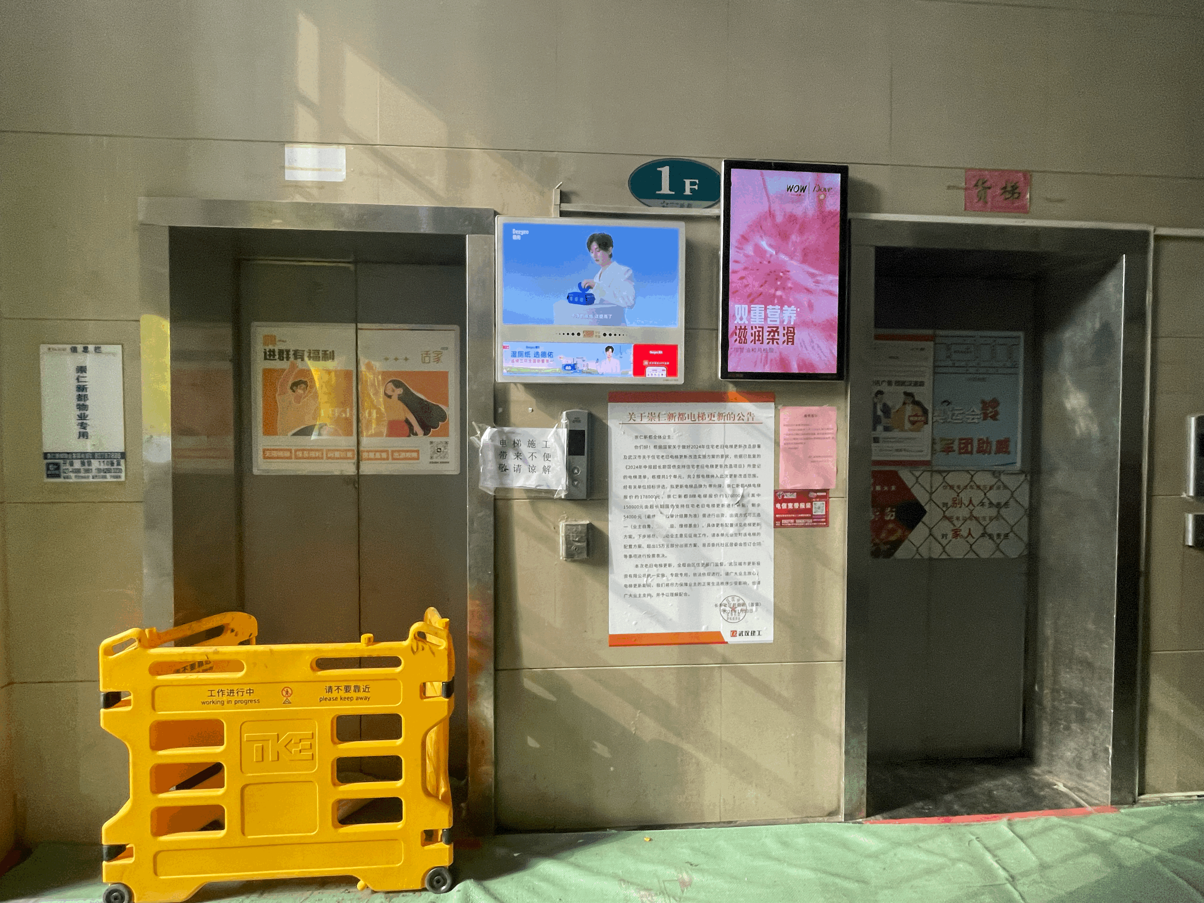 长江日报大武汉客户端4月8日讯(记者尹勤兵)“两部电梯,轮换拆装,估计5月底就能完工!”4月7日,武汉市硚口区汉中街长寿社区“崇仁新都”小区物业经理邓波指着《施工安民告示》,向正进出的居民们一边解释一边报喜。