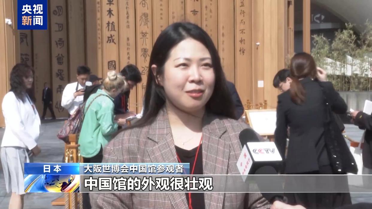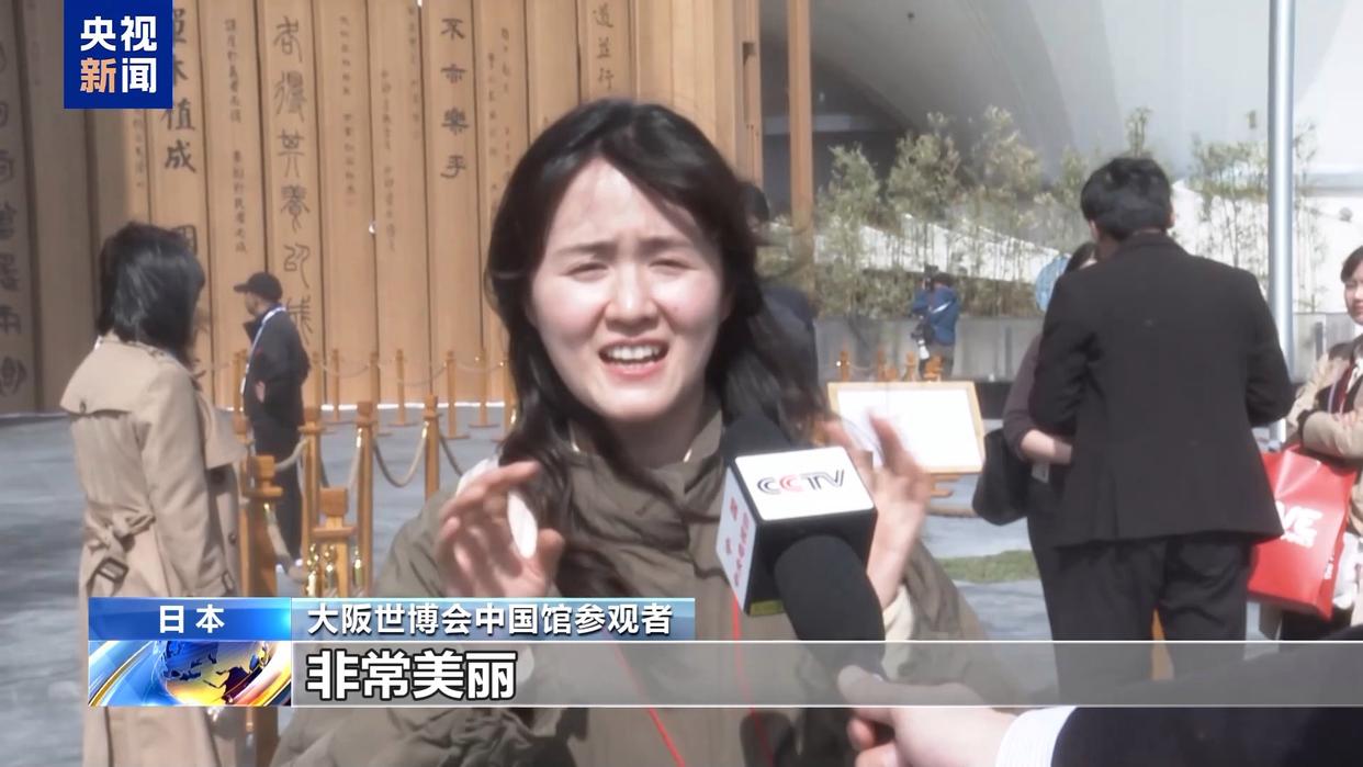 大阪世博会中国馆参观者:刚才我第一次看到中国馆,非常美丽。我第一次试了那样的VR眼镜,很高兴。
