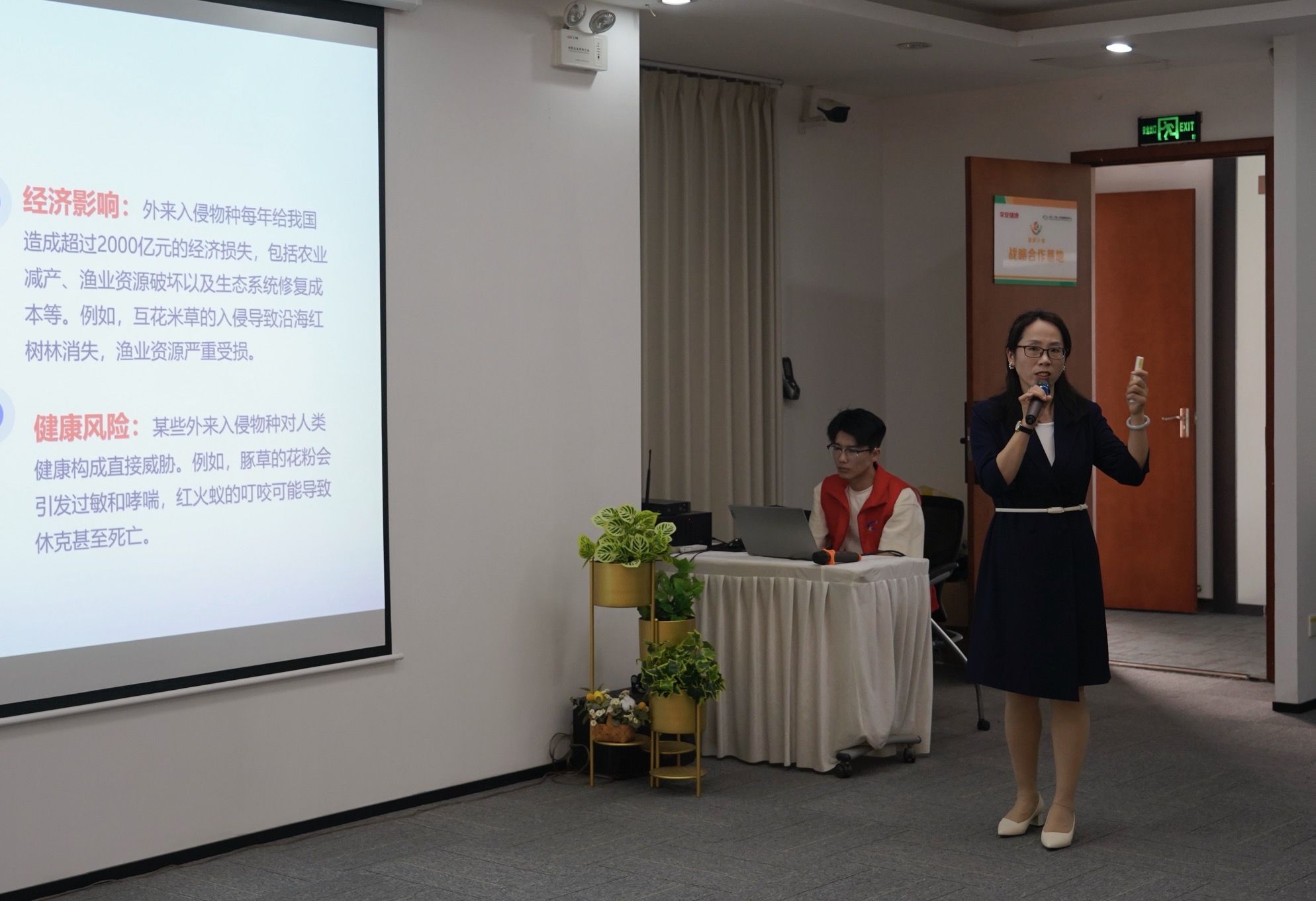 随后,全体人员观看武汉市国家安全微视频优秀作品《守光者》及国家安全保密公益宣传片。专题讲座环节,武汉市农科院博士张润花以“守护绿色长城——植物生物安全与生态危机防控”为题,结合全球生物入侵现状,从植物生物安全核心概念切入,分析生物热点问题、未来趋势及应对策略。她以松材线虫、加拿大一枝黄花、凤眼莲为例,详解外来物种入侵路径及危害:松材线虫借松墨天牛传播,导致我国松林中松树大量死亡;加拿大一枝黄花凭借超强繁殖力挤占本土植物生存空间,破坏生物多样性;凤眼莲泛滥堵塞航道,严重威胁水生生态系统。“不随意携带外来植物种子、发现可疑物种及时报告,每个人都是生物安全防线的‘守护者’。”张润花的呼吁引发现场共鸣。