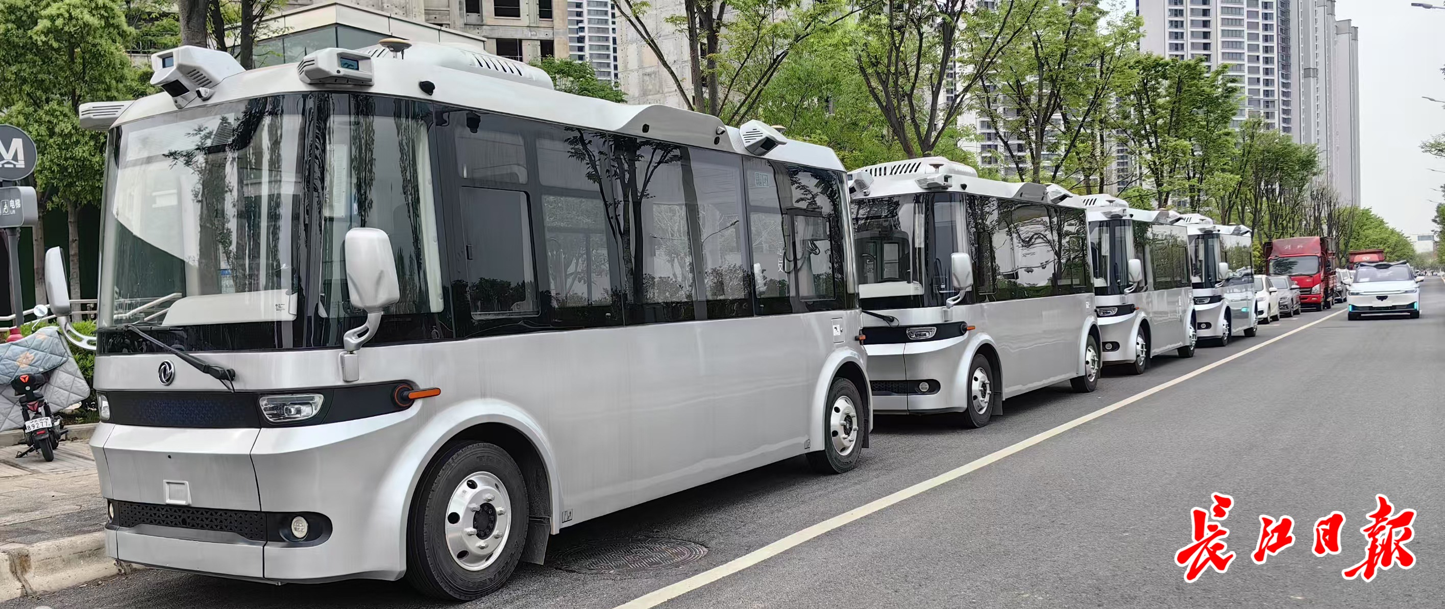 长江日报大武汉客户端4月10日讯(记者汪甦 通讯员蓝俊)4月10日,武汉经开区军山新城,一辆辆银色东风悦享自动接驳小巴正在忙碌穿梭。这是武汉又一新的自动驾驶应用场景,东风悦享的四条自动驾驶小巴接驳线路正式投入运营。即日起,市民在相关线路乘车点等候,就可以免费体验“未来出行”。