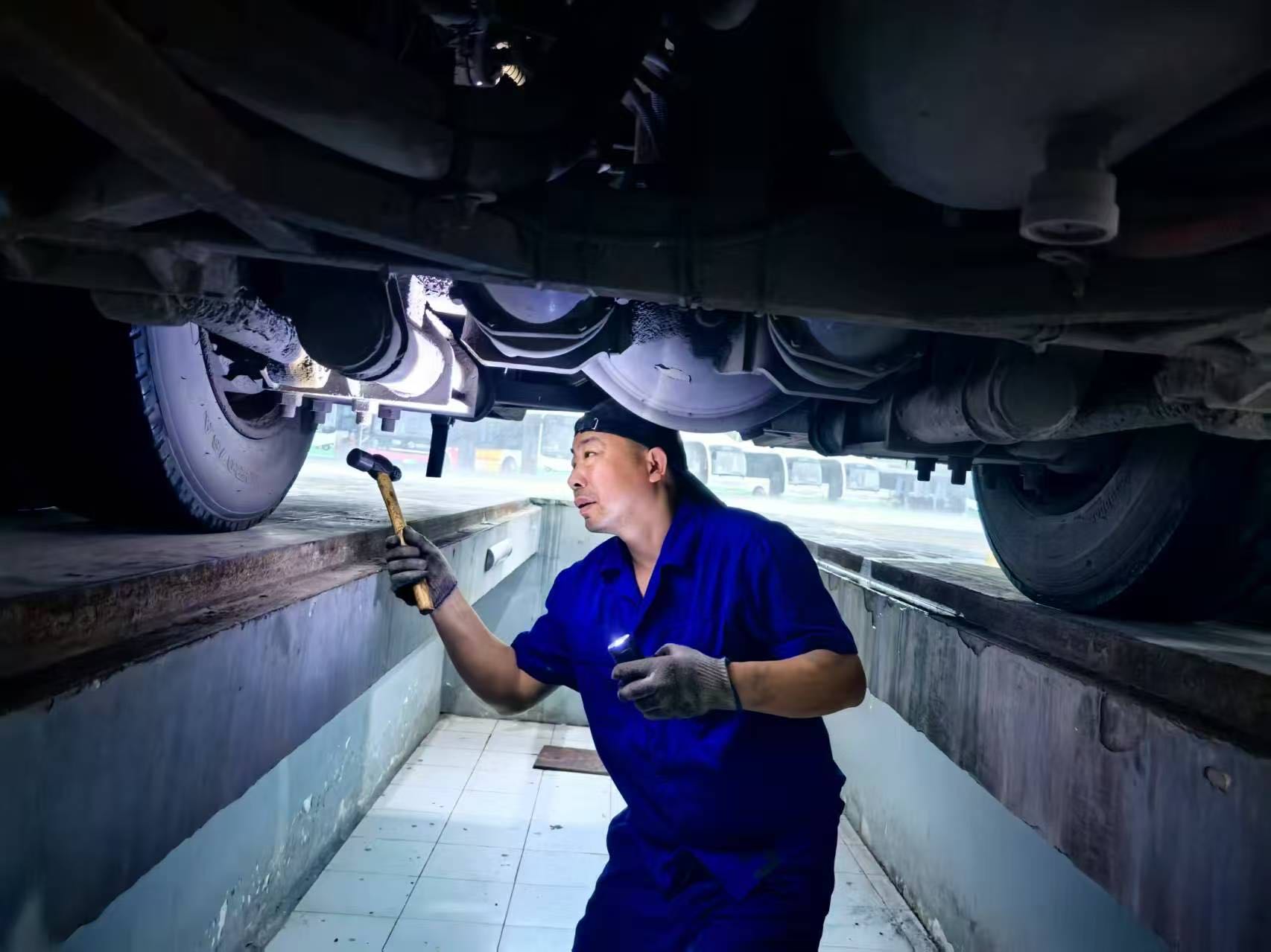 在江岸中环商贸城公交枢纽站,技工陈传勇一大早就按照恶劣天气应急预案检查车辆。通讯员供图