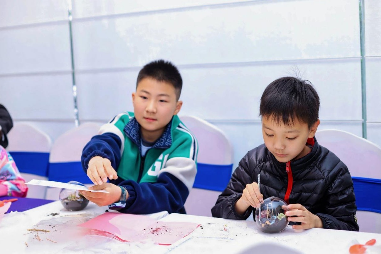 在“绿洲共创”环节,亲子家庭将民勤沙土、武汉湿地苔藓和梭梭苗组合成“移动的绿洲”微景观。家长林茂威带着儿子用小石子铺出“长江”的形状:“治沙和湿地保护都是守护生命线。等孩子上初中,我一定带他去民勤亲手种梭梭。”现场统计显示,活动共认养梭梭树近30棵。
