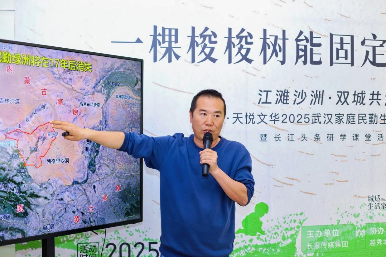 “原来一棵梭梭树能固定10平方米的黄沙!”4月12日下午,在武汉越秀·天悦文华会所内,5岁的王奕博高举小手,第一个抢答出正确答案,稚嫩的声音引得现场一片掌声。这是长报传媒集团2025长江头条研学课堂首期活动的生动一幕,从甘肃民勤赶来的全国绿化劳动模范、甘肃青梭公益发展中心执行主任马俊河,为近30组武汉家庭上了堂生动的生态课。
