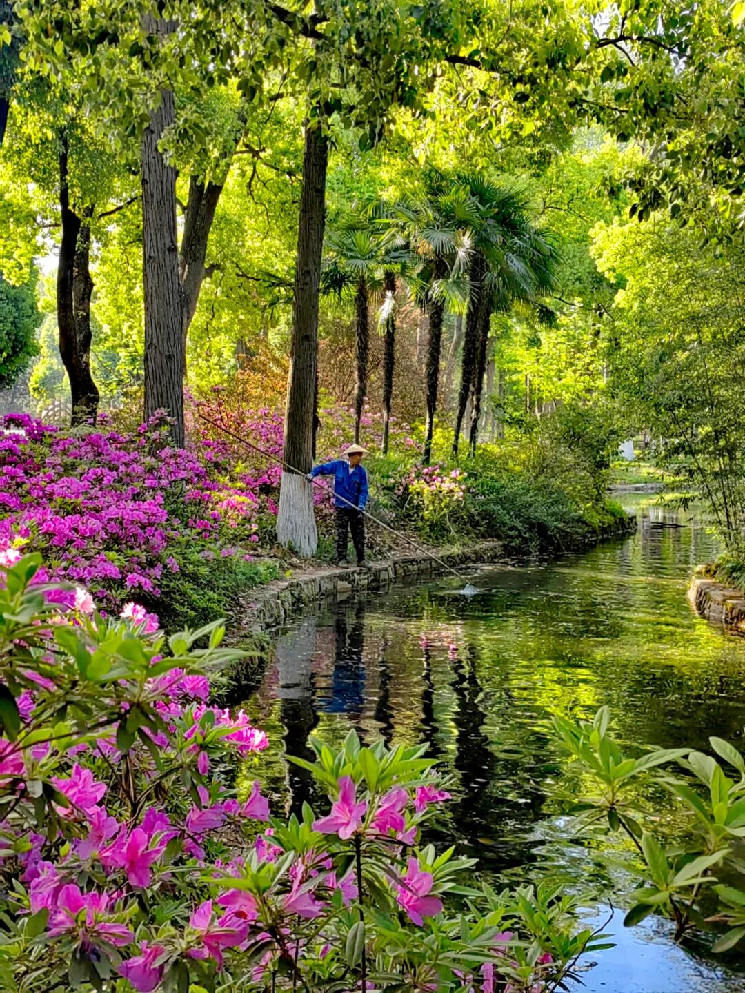 第一次上午8点前去拍外景,在青山公园杜鹃园外,瞬间就被治愈了。晨光透过树梢,把有倒影的水面立体化了,一幅大自然浑然天成的油画,展现在我面前。感叹的同时,发现园内的保洁师傅正在打捞水面的落叶及杂物,阳光下,他也成为画中人。