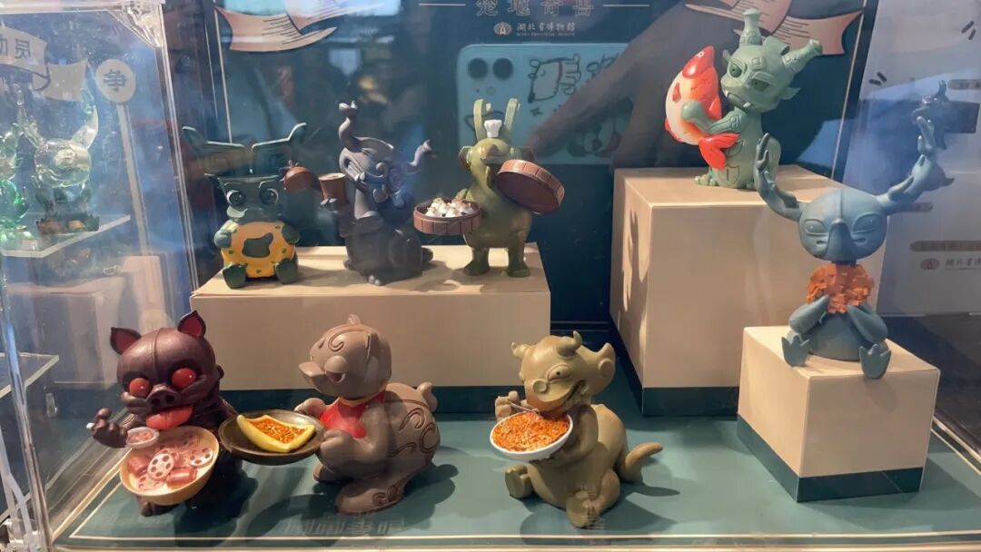 在江汉关钟楼听过百年江涛,于黄鹤楼顶收尽楚天云雨后,我们带着满身烟火气踏进湖北省博。从早逛到下午,领略了曾侯乙编钟的泠泠清音,见识了梁庄王送给爱人的璀璨宝石,出来后还来不及多回味一会,只见展柜彼端的文创连廊里一堆人在围观,走近一看,货架上一堆青铜神兽们正捧着碗大快朵颐,直接抓住了我们的眼球。