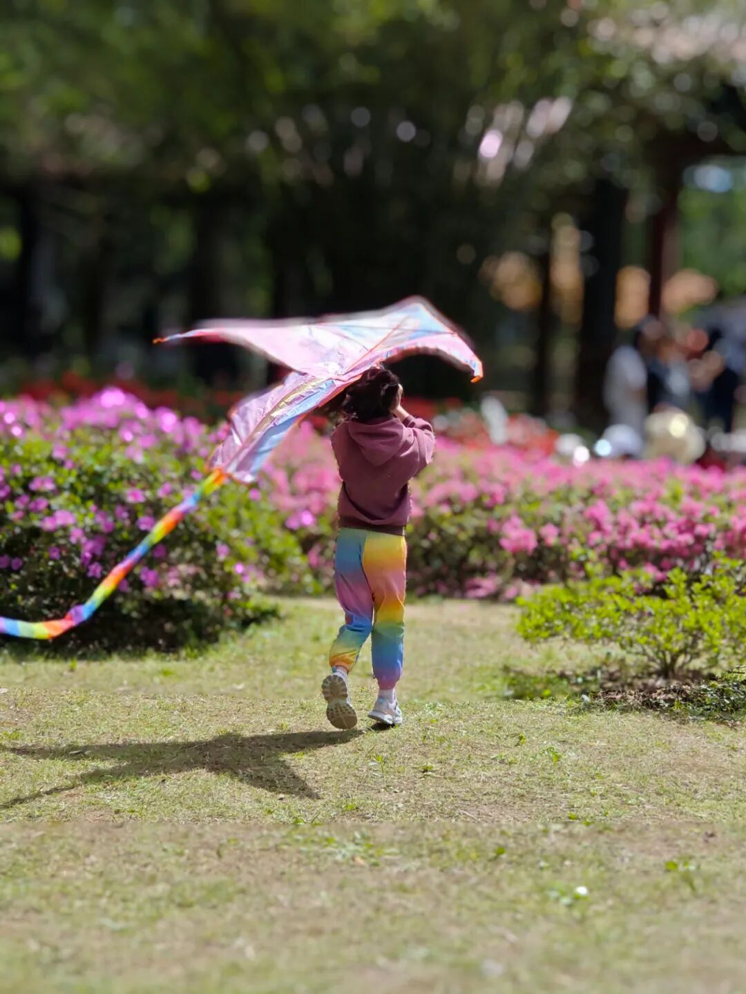 杜鹃花丛里,童趣随风筝飞扬,欢乐舞动春光。摄于青山公园