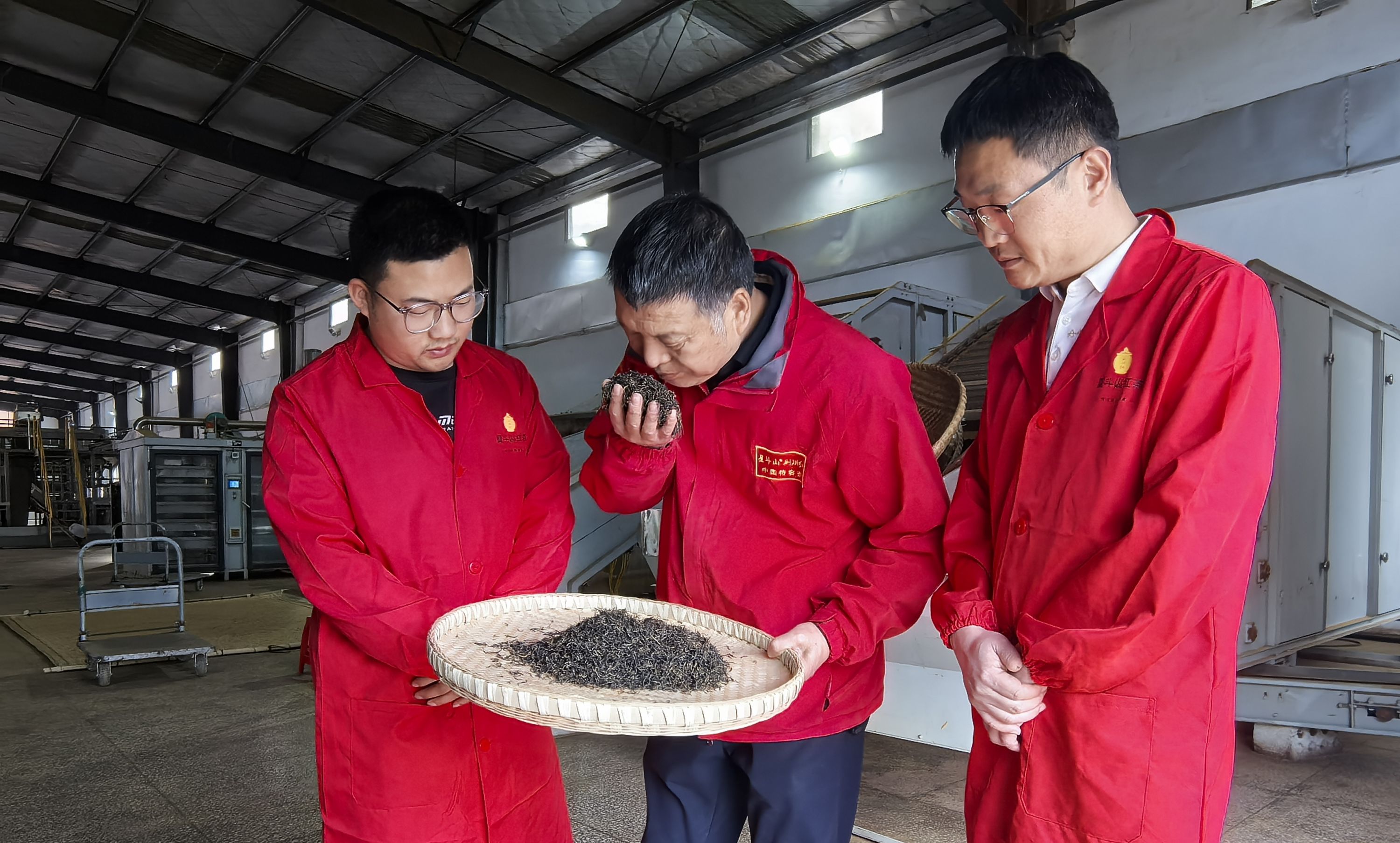邱建红(中)正在厂里指导徒弟加工红茶。