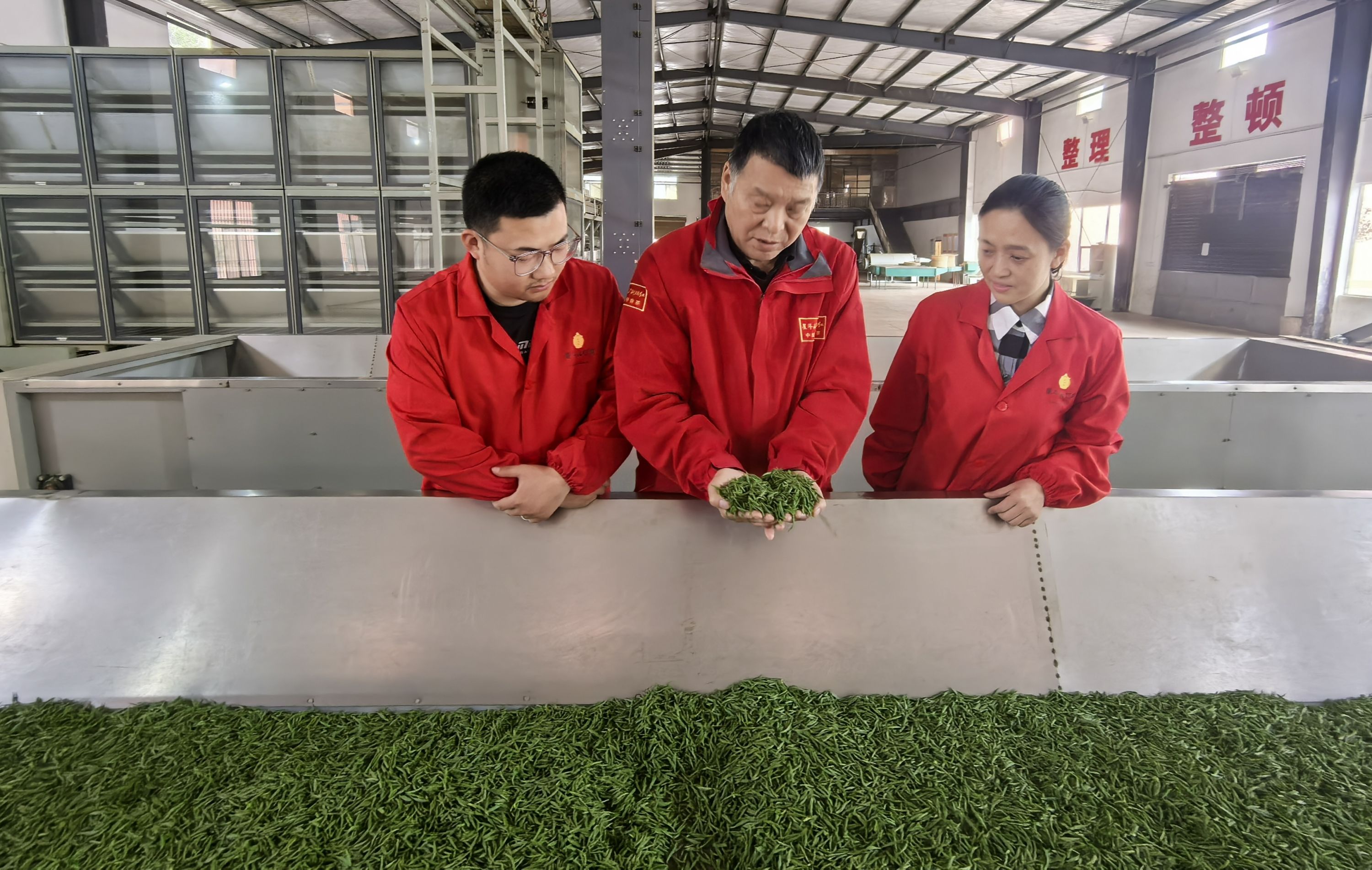 邱建红(中)正在厂里给徒弟讲解茶叶加工要领。