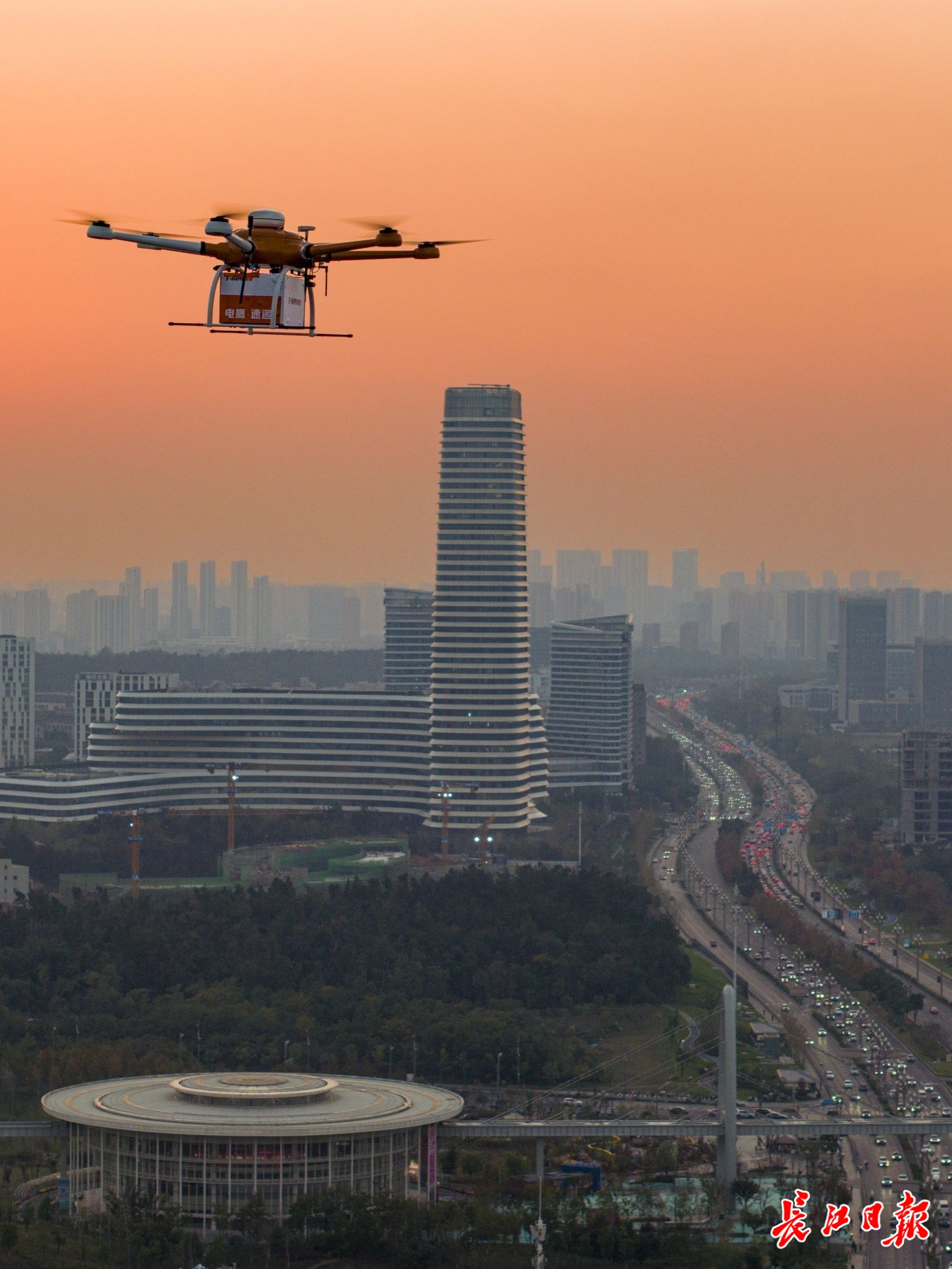 2024年11月11日,电鹰科技无人机EMH1600带着顾客下单的化妆品,从光谷综保区跨境购品源生活广场起飞,历时10分钟左右,送达湖北科创供应链基地。长江日报记者 胡冬冬 摄