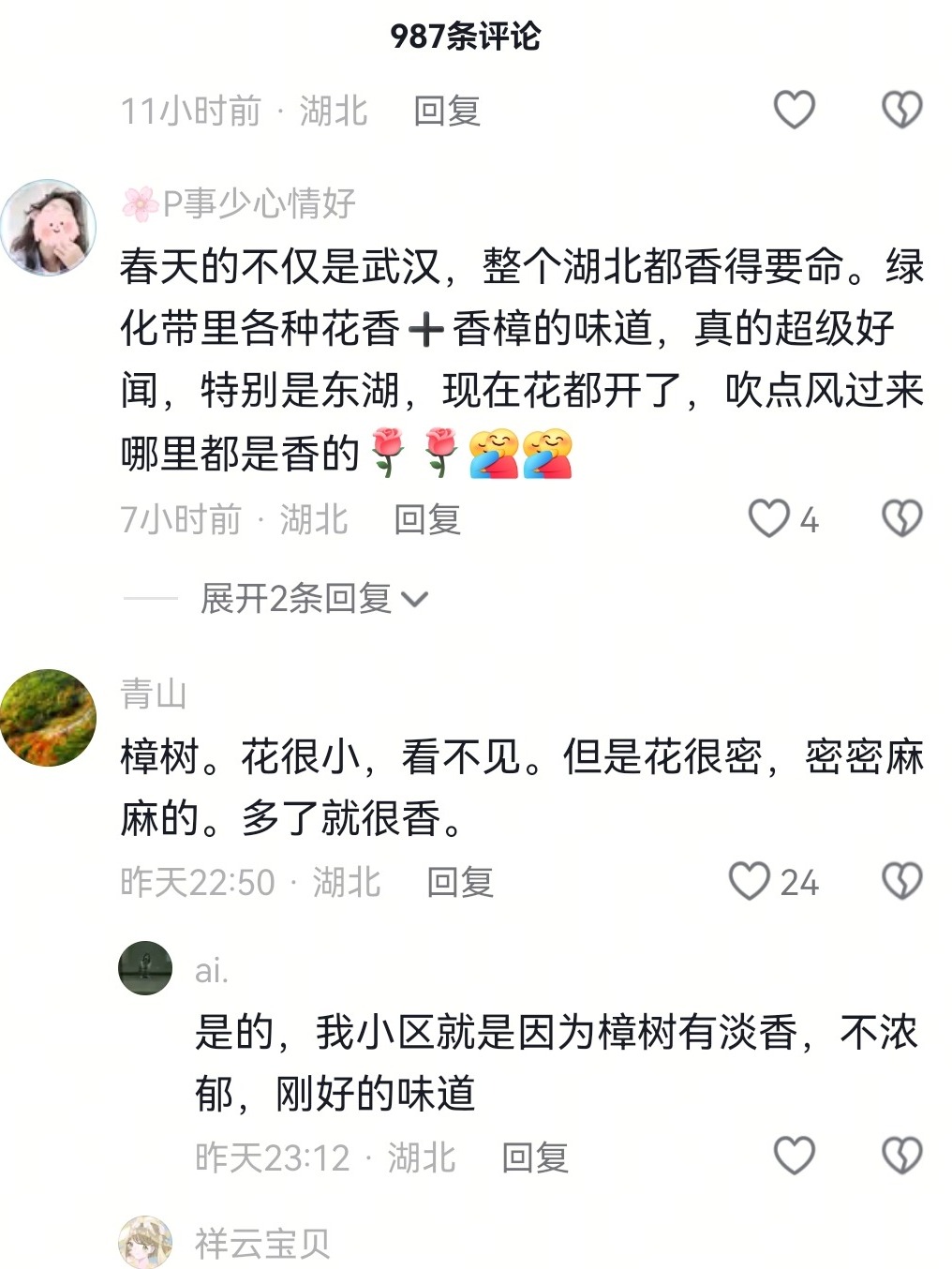 也有网友说:“你很幸运,错过了石楠花,遇见了柚子花,很香很香。”“武汉除了开石楠花的时候臭,其他时候都是香的。”
