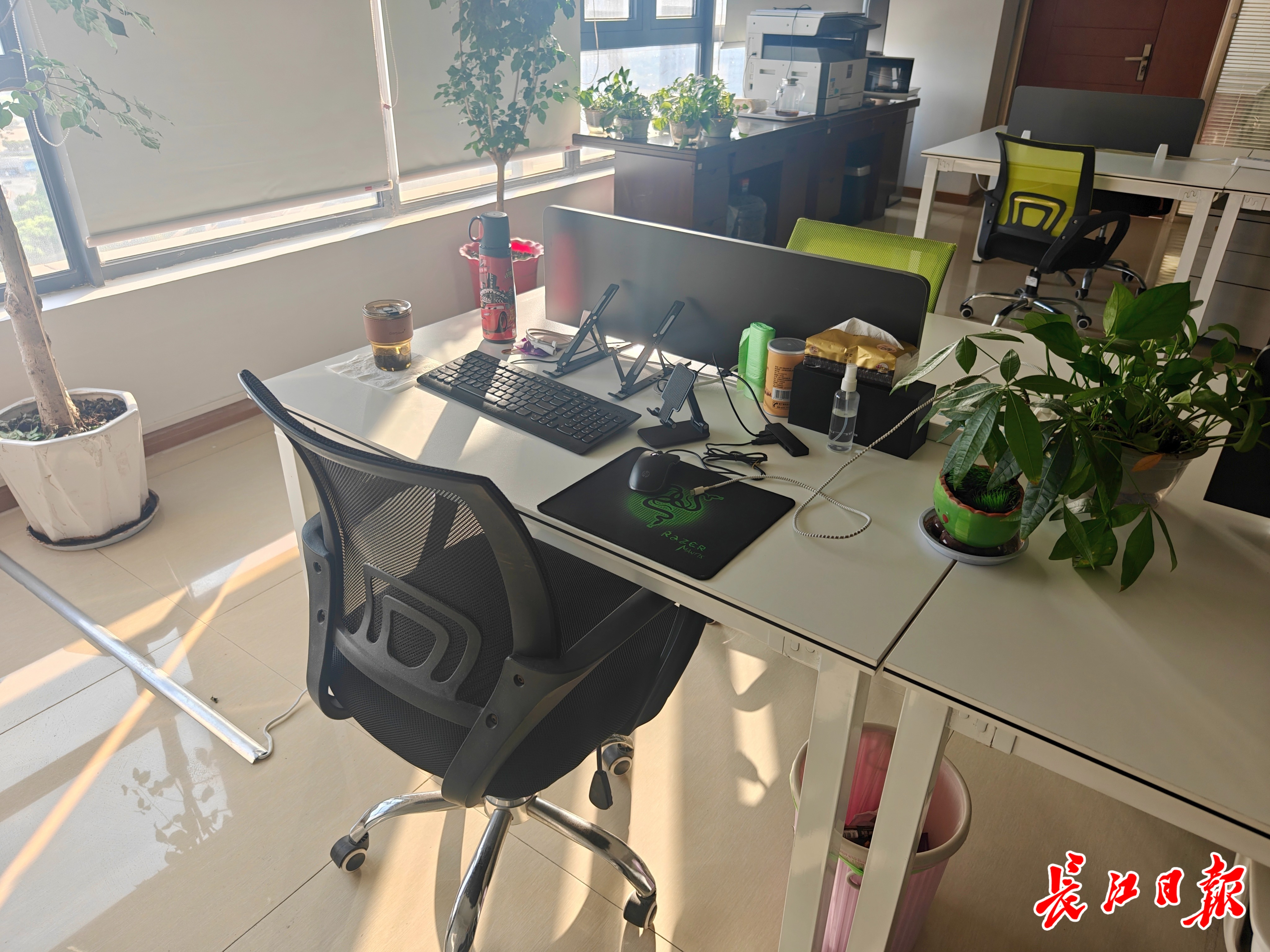 长江日报记者来到绿地国博财富中心26楼的“清悦空间”,乍一看,这个共享办公室与普通办公区没有太大区别,除了办公桌和电脑,还有打印机等办公用品,办公桌上还摆放着水杯、绿植等个人用品。
