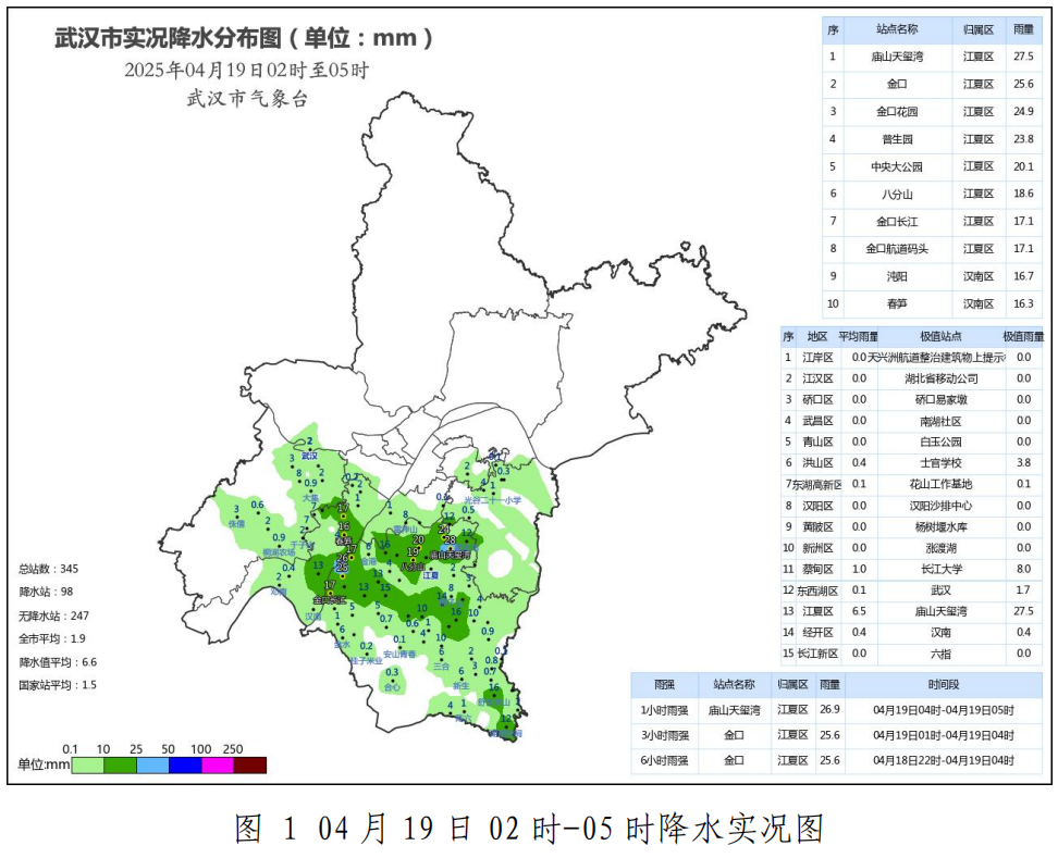 4月19日2时至5时雨量:江夏区7—27毫米,武汉经开区2—17毫米,洪山区1—3毫米,东湖新技术开发区1—4毫米,蔡甸区1—8毫米。过去3小时最大累计雨量和最大小时雨强均出现在江夏区庙山天玺湾站,分别为27.5毫米和26.9毫米(出现时间19日4时—5时)。