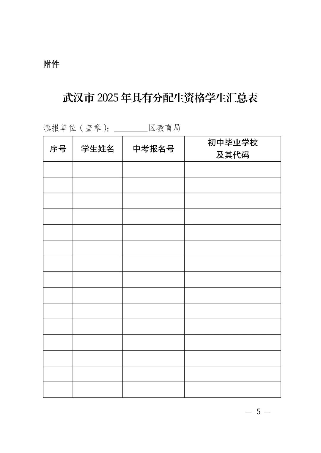 2.各区审定、上传。4月24日前,各初中学校将公示无异议的具有分配生资格学生名单报区教育局。区教育局审定后,汇总名单于4月25日前上传武汉市中招综合管理平台(地址:zkzz.whzkb.cn)。同时将《武汉市2025年具有分配生资格学生汇总表》(纸质盖章版和Excel格式电子稿)报市教育局基础教育处,联系人:黄肖,联系电话:65608503。