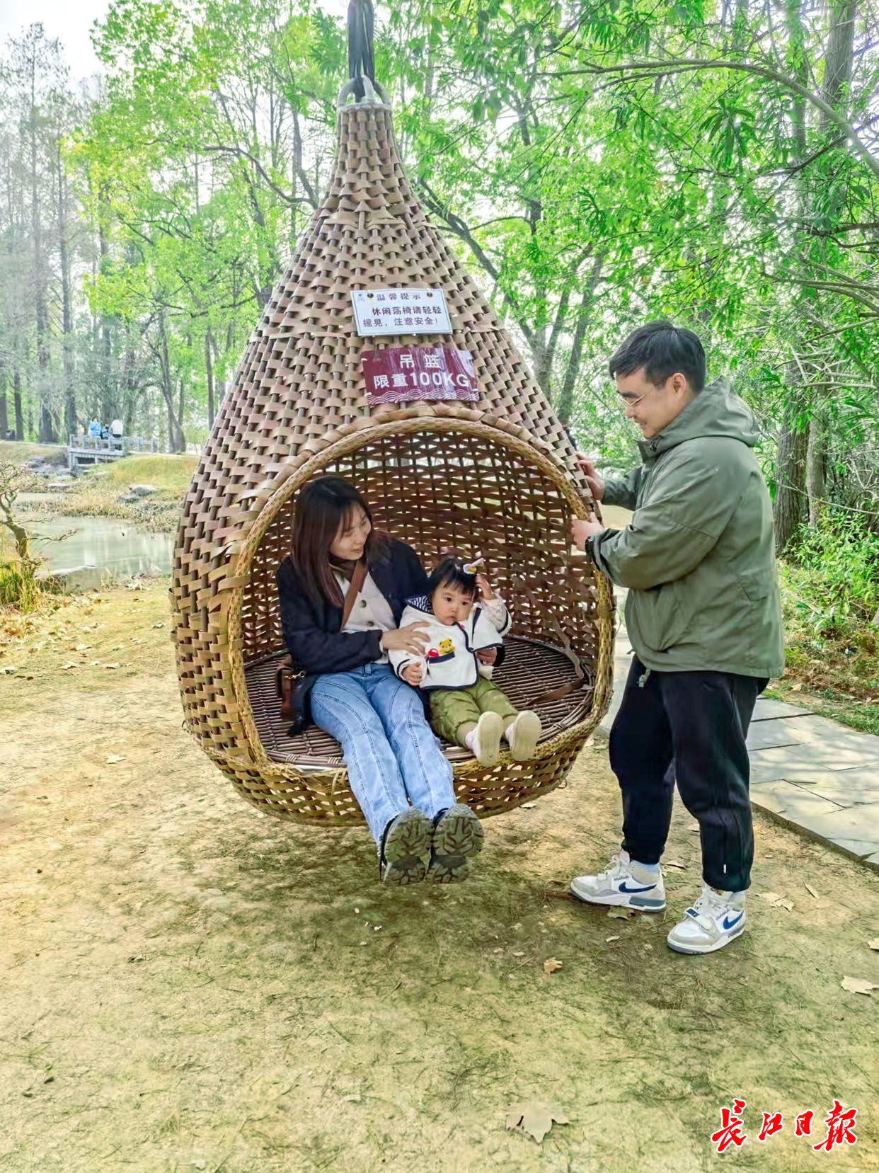 长江日报记者看到,编织的棕褐色镂空结构呼应森林肌理,既与景区生态景观融为一体,又为游客提供了沉浸式的休憩体验。东湖落雁景区相关负责人介绍:“园区内共设置了11处水滴形吊篮,采用环保材料架空搭建,避免破坏原生植被根系,形成‘树屋共生’的生态微系统。中空造型兼顾遮阳避雨功能,为的就是让游客躺在里面,停下来,在绿氧环绕中感受到阳光倾泻森林间的温暖光影。”