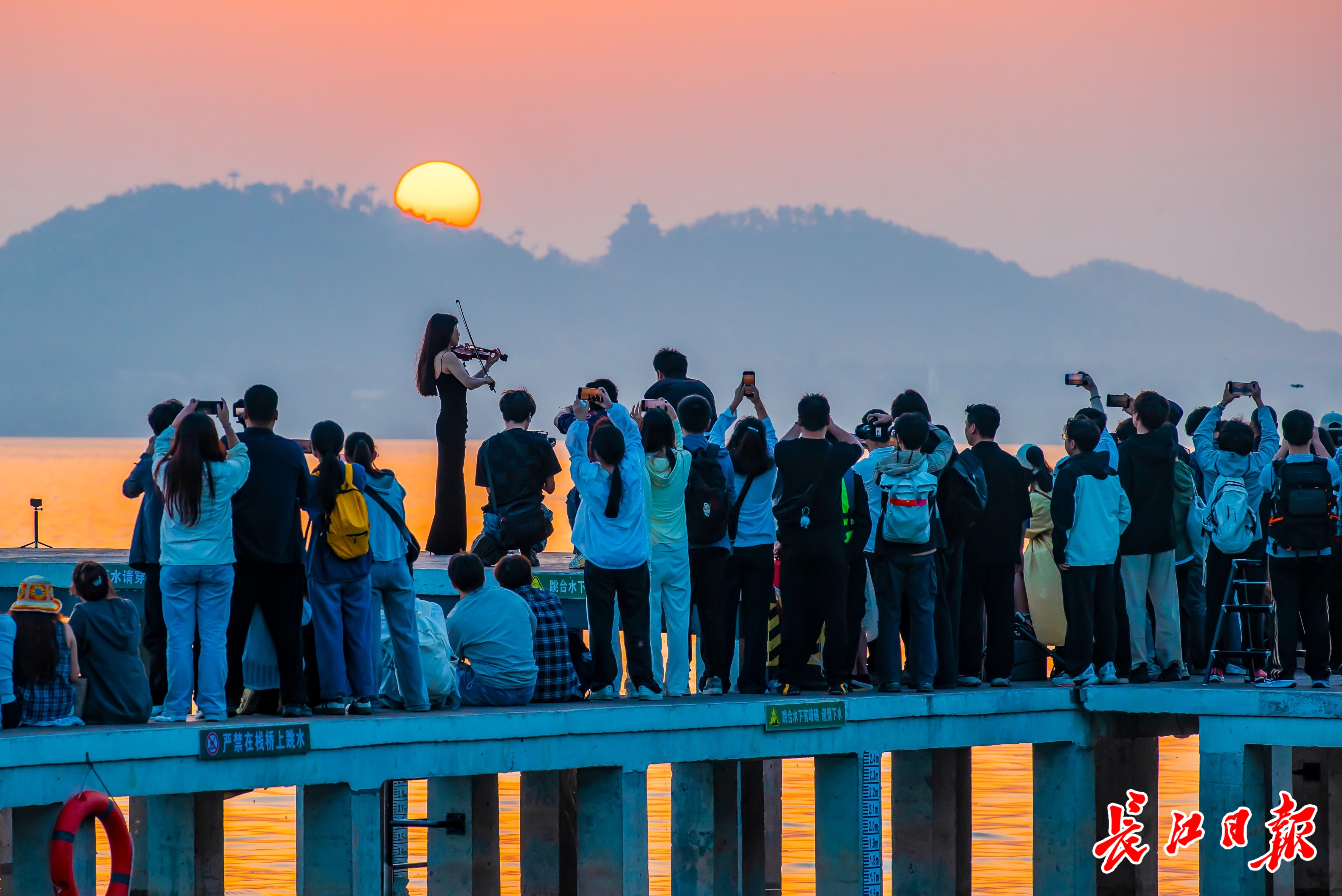 东湖凌波门,游客在悠扬琴声中迎接日出时刻。长江日报记者何晓刚 实习生杨星辰 摄