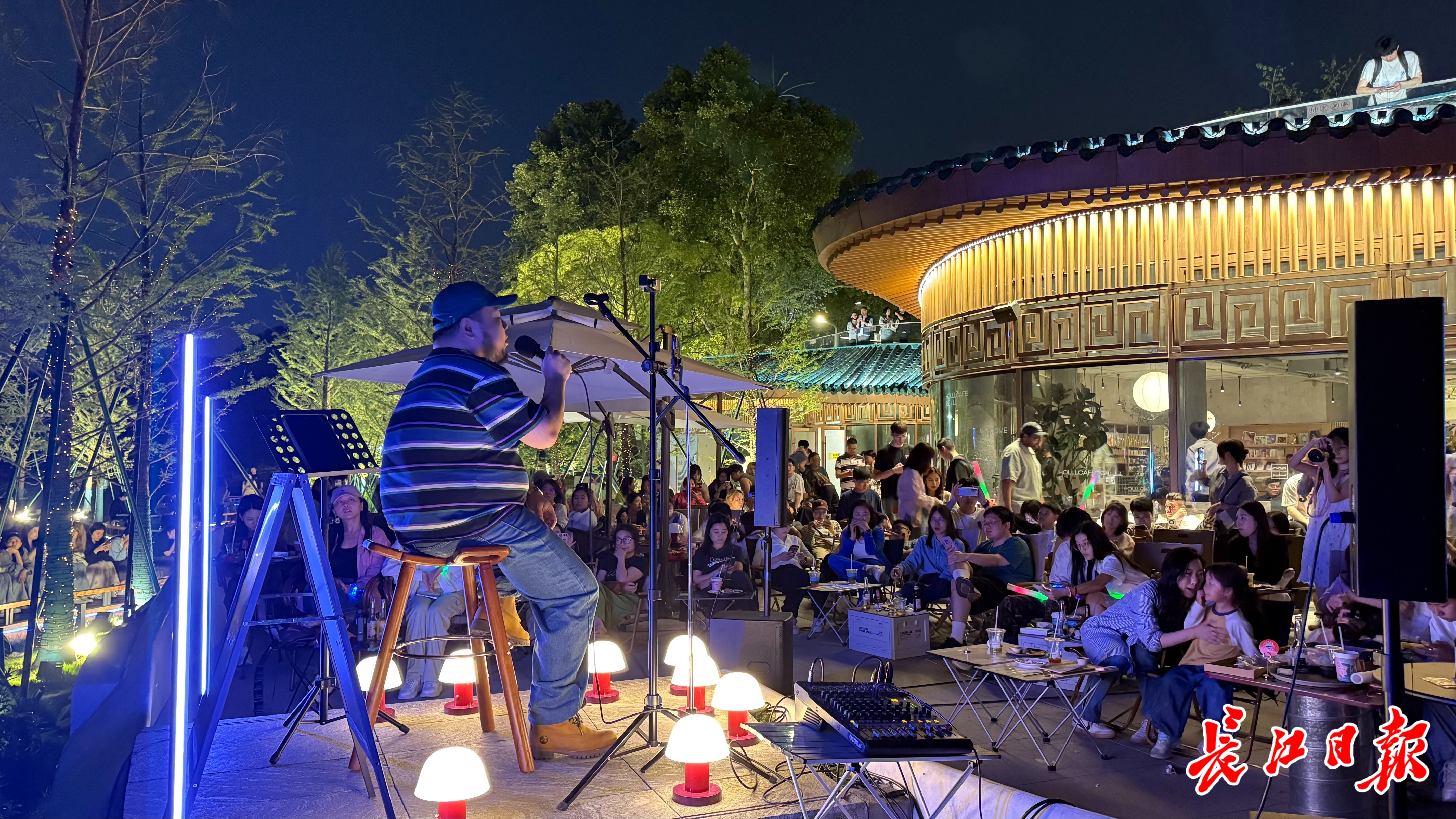 4月19日晚,东湖绿道三期凌波门平湖珞樱观景台上,以山水为幕,湖山音乐会在上演。树梢在晚风中摇曳,歌手在舞台上唱着蓝调歌曲,数百名游客或在休闲椅上轻声絮语,或在木质平台上倚栏静赏,或干脆坐在台阶上轻摆身体,沉浸在清凉湖风、浪拍堤岸与音乐韵律的交织中。