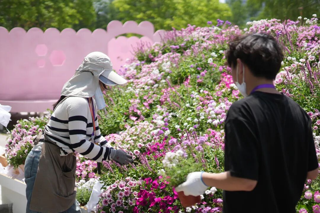 园艺师在滨水广场布展。沙湖公园管理处供图