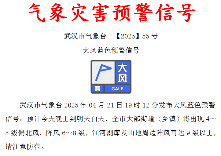 ● 蓝色预警:今天白天,武汉大部阵风6—8级,请注意防范。