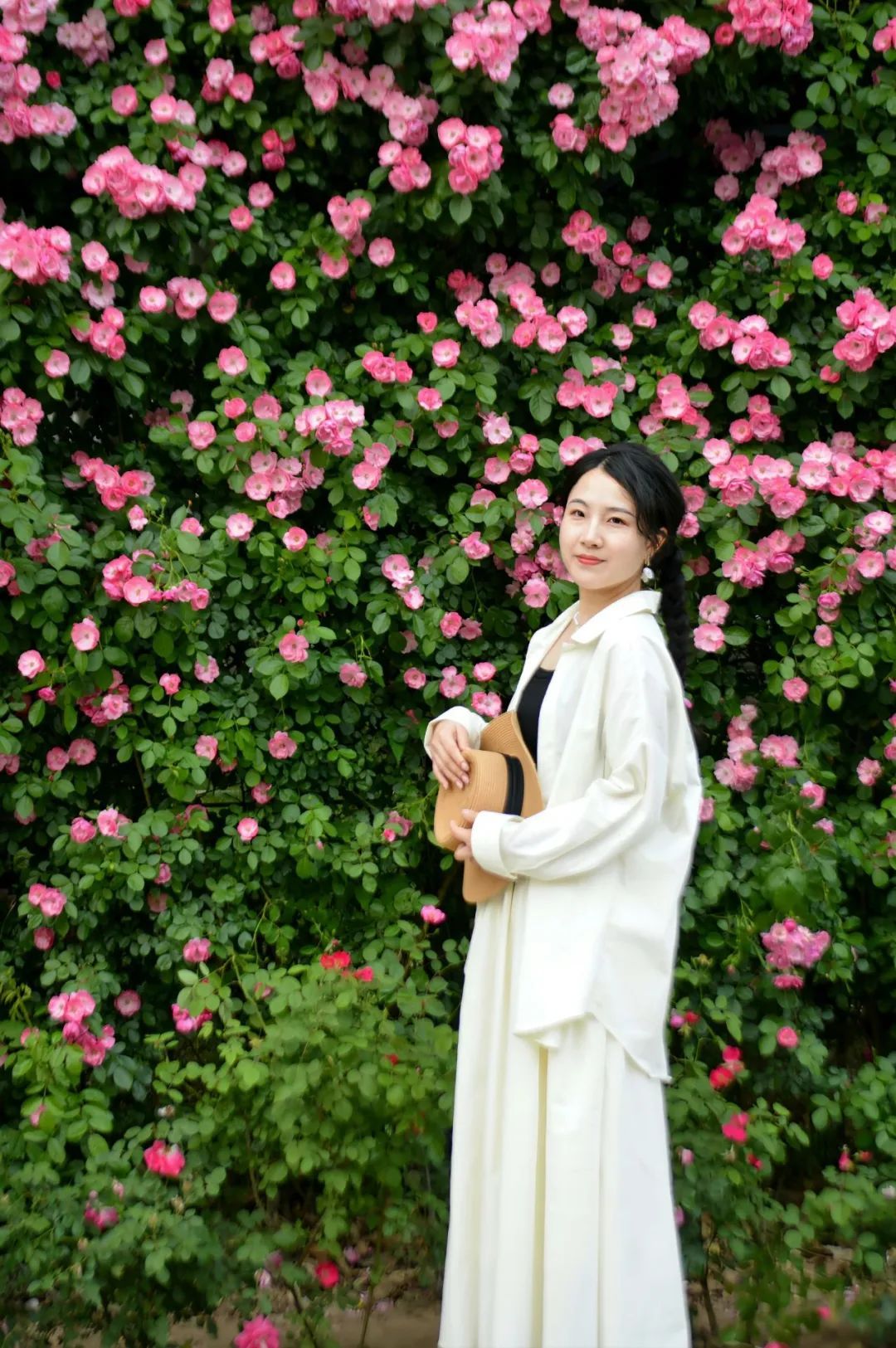 一位女子站在一片盛开的花墙前。她手中拿着一顶帽子,面带微笑,神情温婉。摄于杨春湖公园