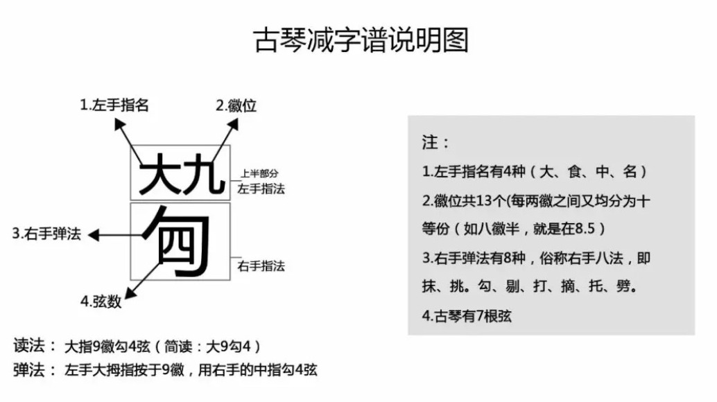 “到了唐代,琴家曹柔在文字谱的基础上加以革新发明了减字谱,用一个字代替一句话。”丁承运举例,减字谱的单个字不能直接读,比如左边一个“大”字,右边一个“九”字,下面一个勾,里面一个“勾”的外框,再加一个“七”,就读作“大九勾七”。“大九勾七”的意思是,左手大指按于第九徽位,右手中指勾弹第七弦。这就是古琴减字谱表达的含义。