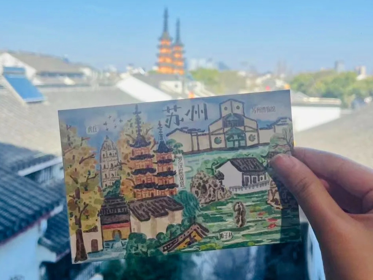 在明信片爱好者的圈子里,“互寄”正成为一种新型社交方式。这既延续了传统笔友间的浪漫,又增添了书写祝福和等待回复的期待。网友“鹅鹅”特意委托张紫薇为家乡泰州设计明信片,还要求加入喜欢的麋鹿元素,随后与各地网友互寄分享。还有不少人手持张紫薇绘制的明信片,前往景点实地打卡盖章,为旅行增添不一样的乐趣。
