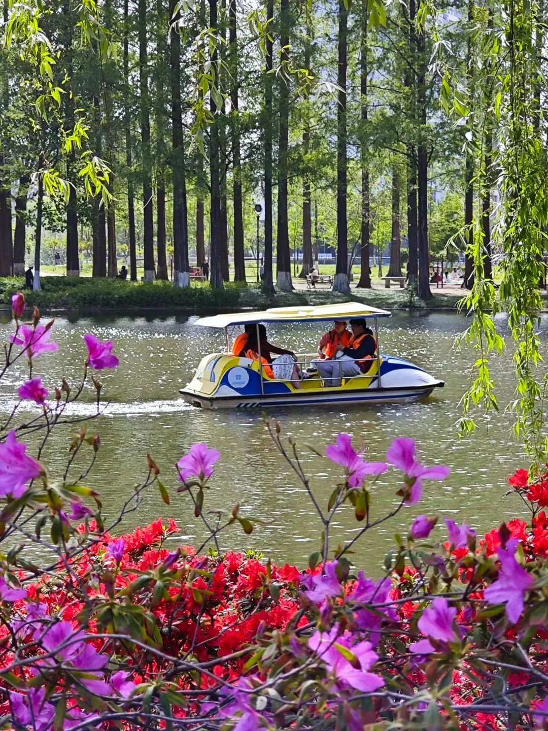 花丛游船荡清波,夏来江城欢乐多。摄于青山公园