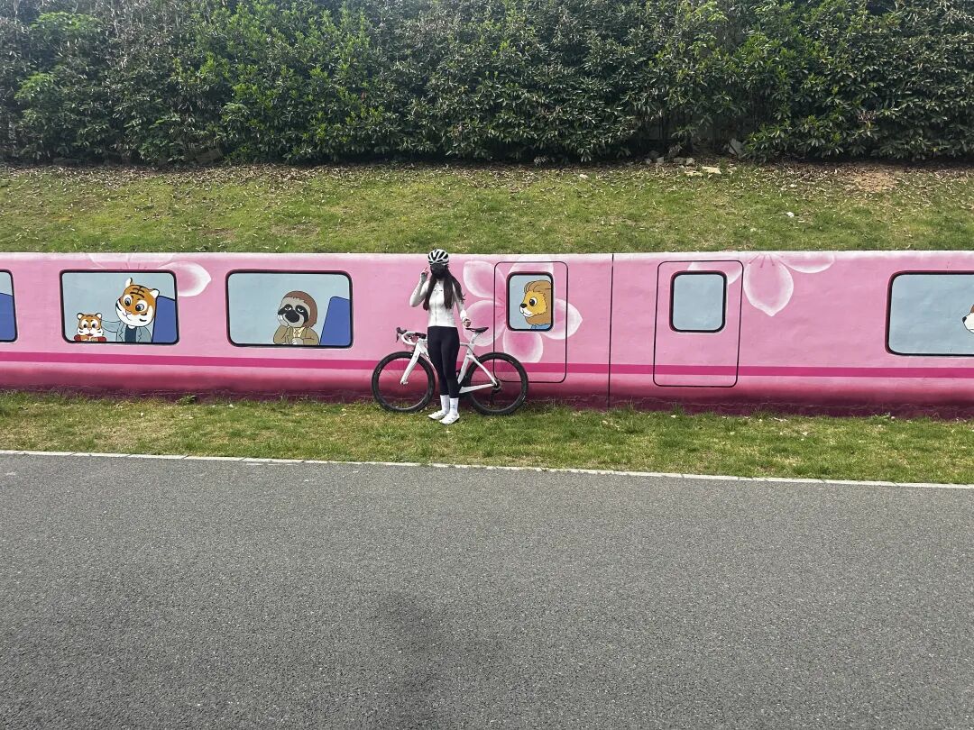 作为主创之一,每次看到游客围着它拍照打卡,我就想起创作时的那些趣事。那天,我们一眼相中了这面墙,巧的是,不远处竖着“武汉火车站”的站牌,盛开的桃花也给了我们灵感:“用粉色作为主色调,让‘高铁’驶向绿道!”