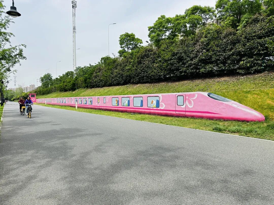 在东湖绿道桃花岛,有个免费打卡的新地标——一列百米长的“粉色高铁”。这列特别的“高铁”不载人,载着28组可爱的动物“乘客”。有憨态可掬的熊猫,灵动俏皮的金丝猴,最逗的是戴墨镜的小老鼠,酷酷的模样,引得小朋友哈哈大笑。