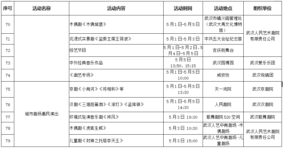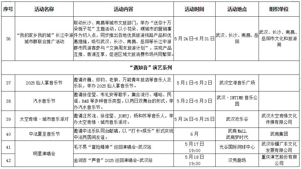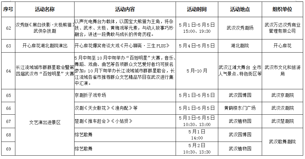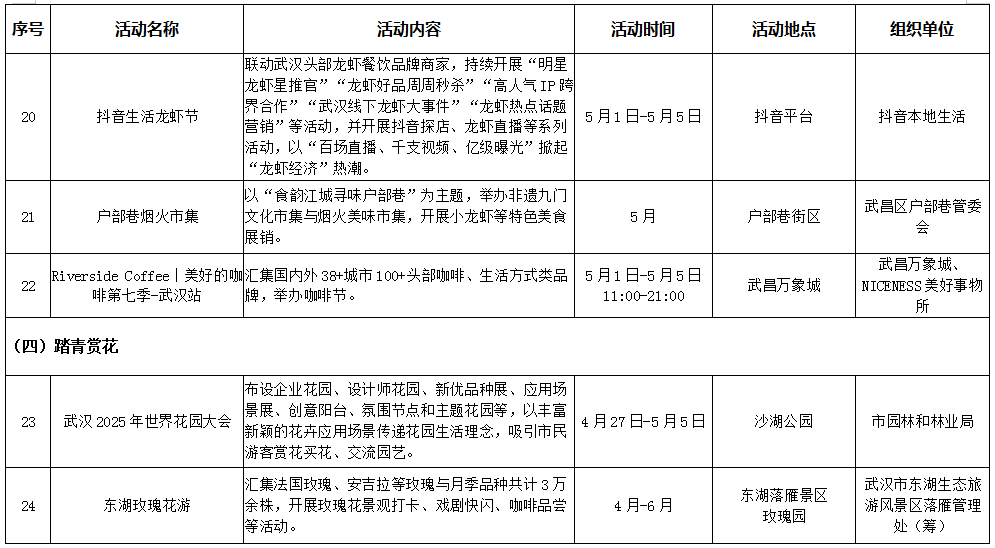 参与中有更多体验。“有剧”——有开心麻花爆笑剧、汉秀版武侠杂技剧、沉浸式悬疑剧、儿童版木偶剧、汉味版小品剧,各类剧目轮番上演、热闹非凡。“有戏”——戏到武汉活,“武汉戏码头”正展演着京剧、婺剧、越剧、楚剧、汉剧、黄梅戏等各地经典剧目,你方唱罢我登场,别有韵味,来武汉,品全国。“有花”——4月27日至5月5日武汉举办2025年世界花园大会,展示主题花园、企业花园、社区花园等花园90个,新优花卉1000多种,来武汉、看世界。“有礼”——武汉礼物,“十大伴手礼”,国潮文创,在各大商圈、景区都有优惠促销活动,游玩之余,带上一份心仪的武汉礼物。“有实惠”——文旅惠民惠企,共享发展红利。5.19中国旅游日期间,武汉整合文旅体商演产业链资源,围绕吃住行游购娱全要素,针对银发族、在岗职工、社区居民、亲子家庭、在校学生、自驾团队,推出配套组合产品和各类惠民政策,让更多市民游客共享文旅发展红利。